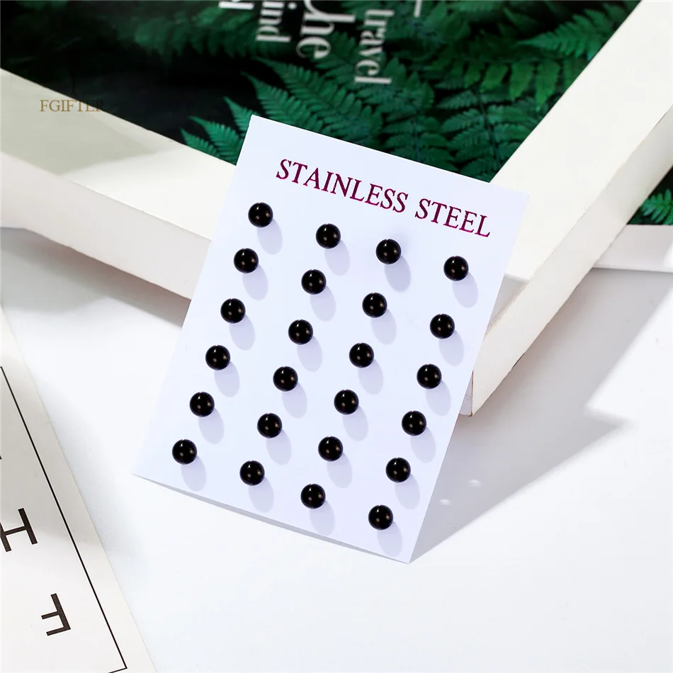 Набор из 12 пар круглых серег-гвоздиков из нержавеющей стали для женщин, мужчин, подростков 2-8 мм, черные серьги-шарики, картриджи для пирсинга, ювелирные изделия