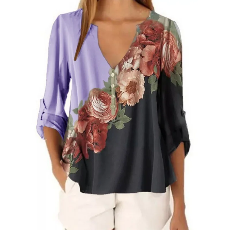 Женская блузка с V-образным вырезом, с цветочным принтом, 2021