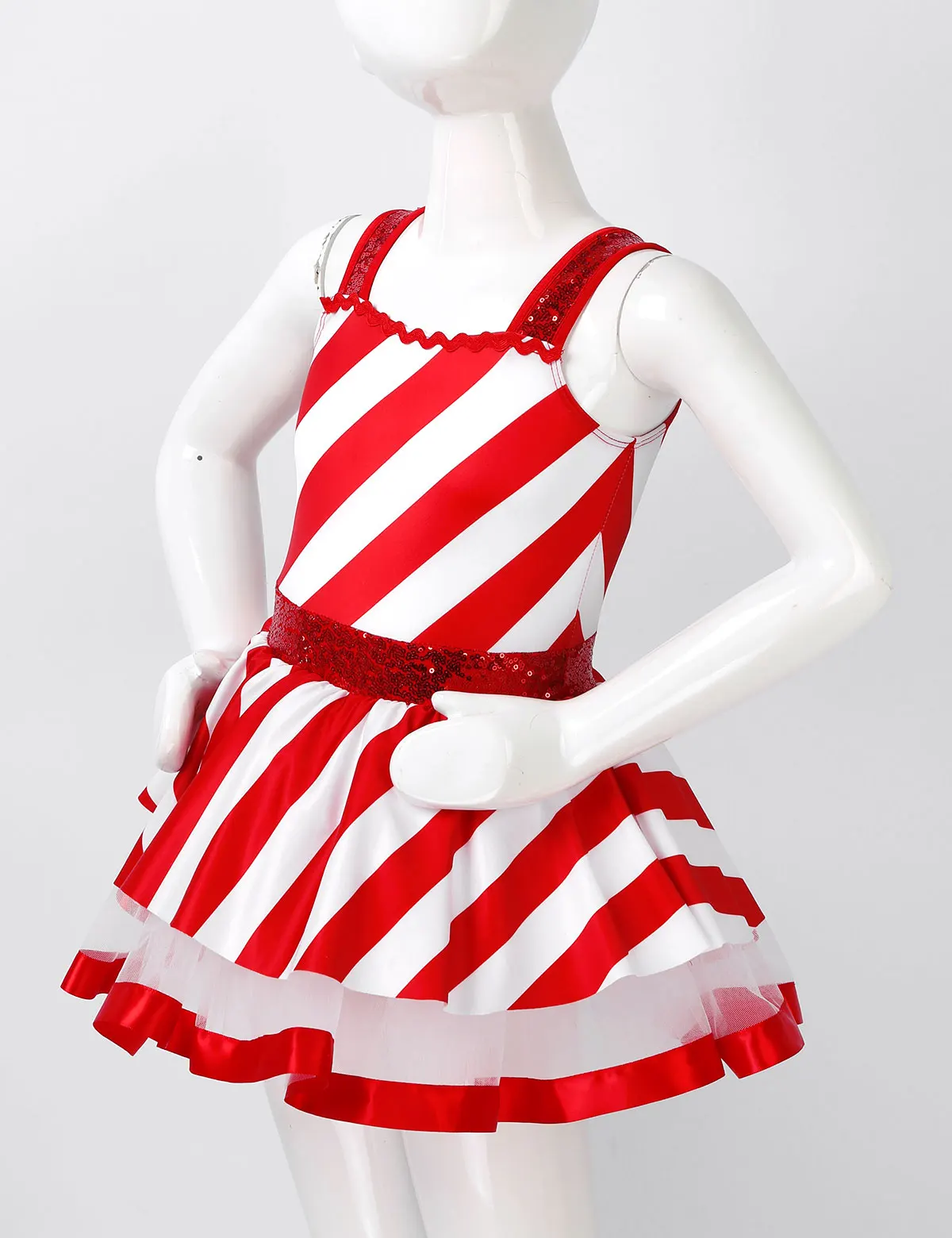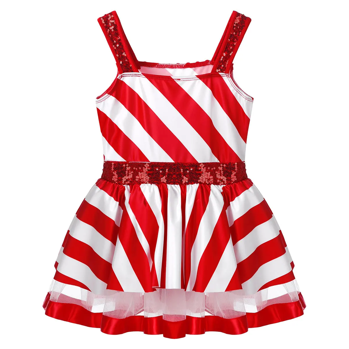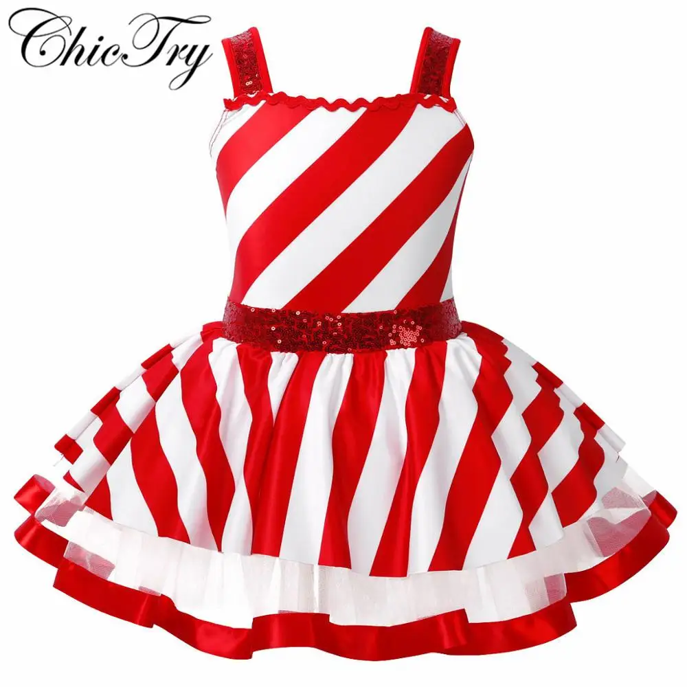 Детские Рождественские танцевальные костюмы для костюмированной вечеринки для девочек, Блестящие Блестки, в полоску, Фигурное катание на коньках, Катание на роликах, балерины, трико, платье-пачка