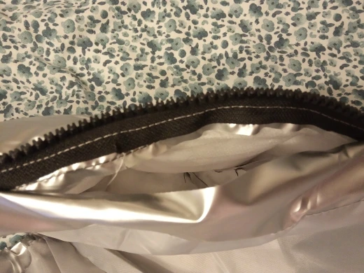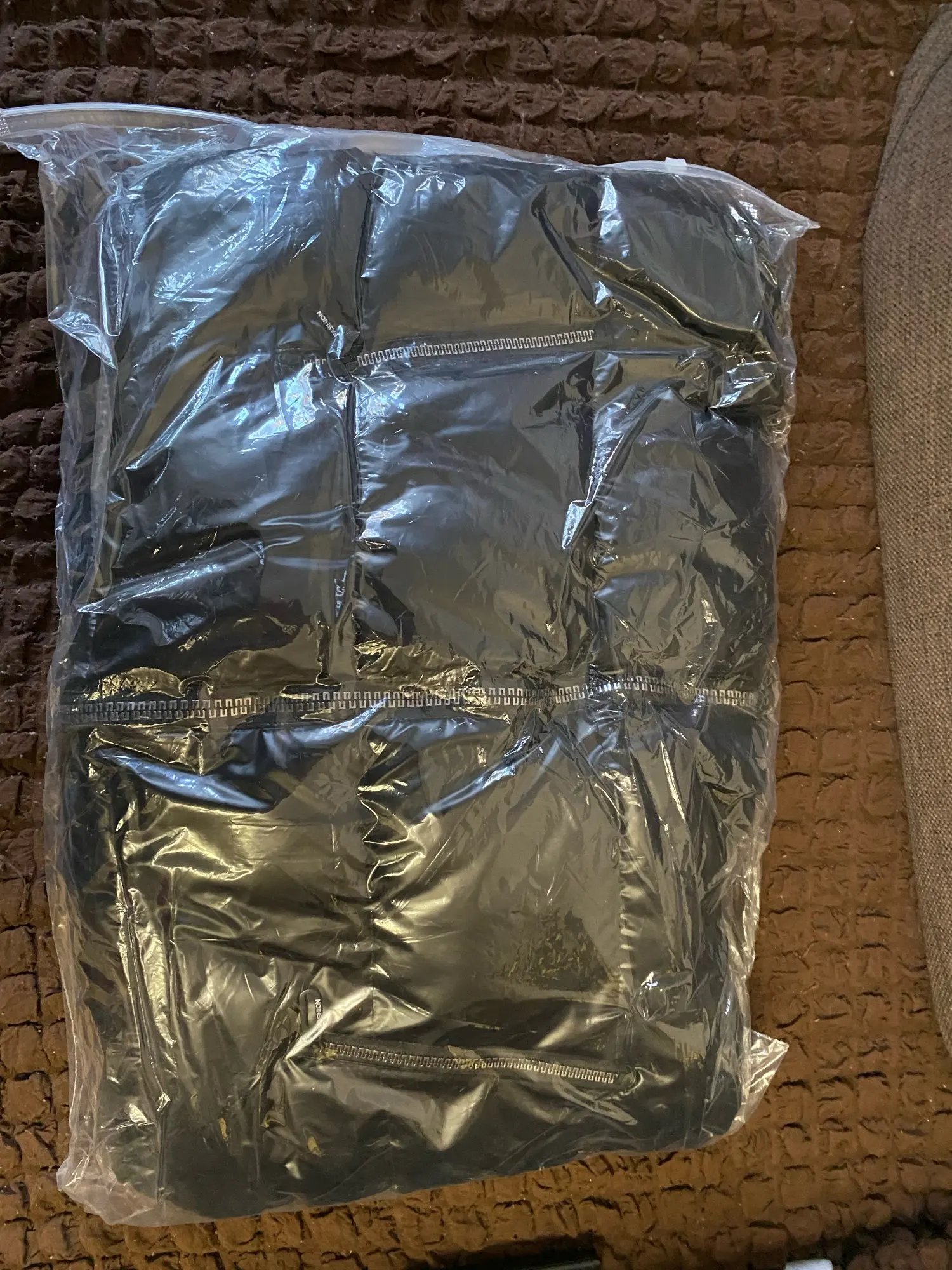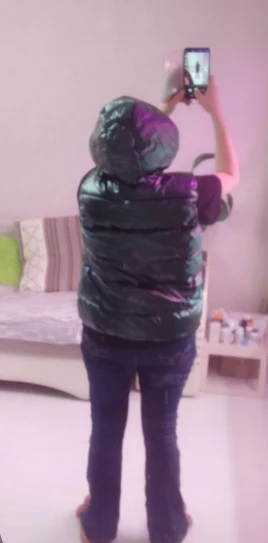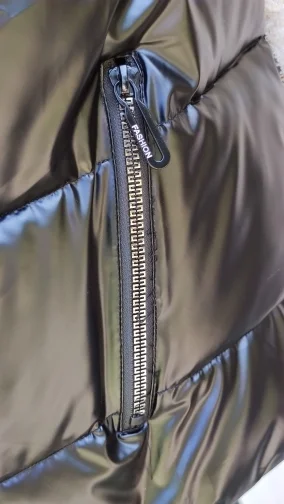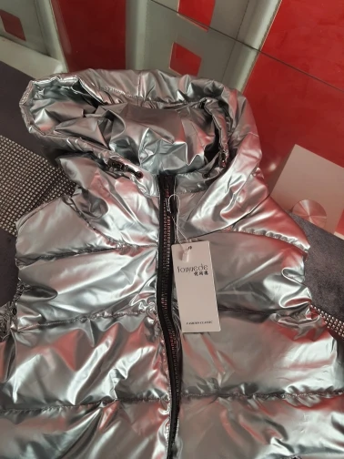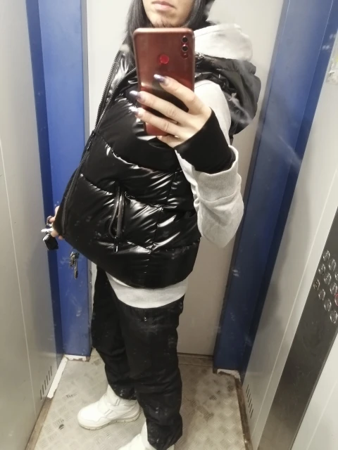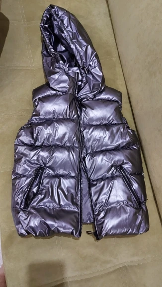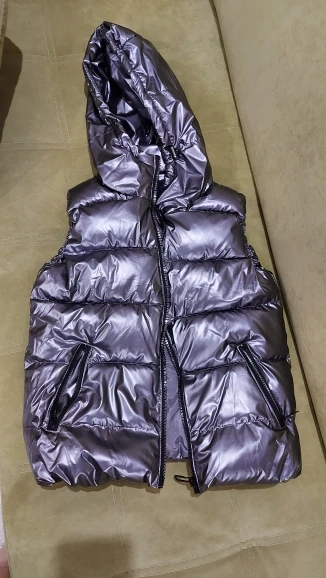 Подошел на российский 48 размер. При распаковке был запах, надеюсь выветрится. Достаточно пушистый и теплый, как куртка, только без рукавов) При движении в области капюшона, где ткань соприкасается, она немного поскрипывает. Молния интересная, блестючая. В целом норм, понравился.