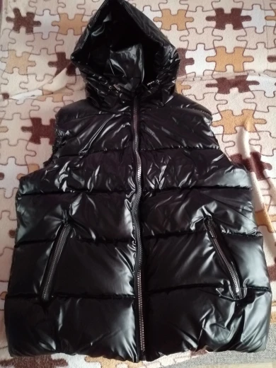 Крутой жилет с капюшоном! У нас такая ткань называется винилом, очень практичная ,не продувается и не промокает.Выглядит дорого. Цветов на выбор всего 5,мой -черный. Размерный ряд до 4Xl.,но! Я взяла на параметры: 88-70-95,рост 168 размер ХЛ и он соответствует европейскому М.Замеры: Длина-60 Ог-98,5 По бокам имееются карманы на молнии,капюшон стягивается. Качество фабричное+ этикетка