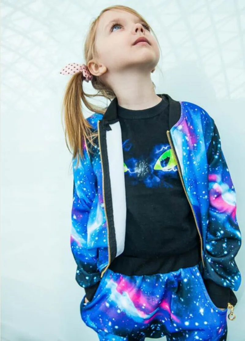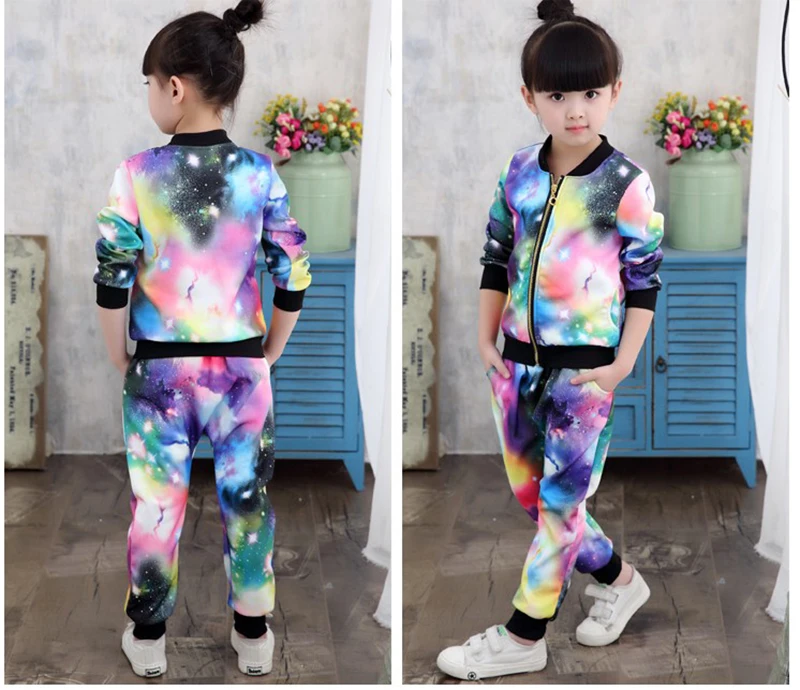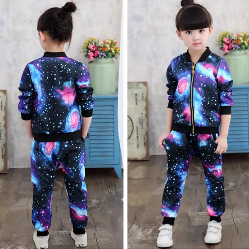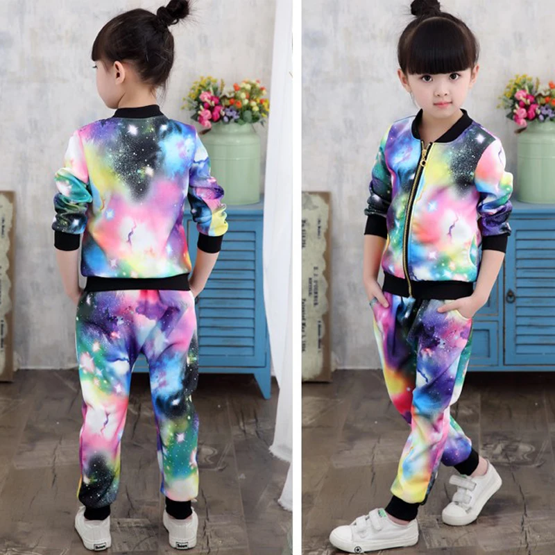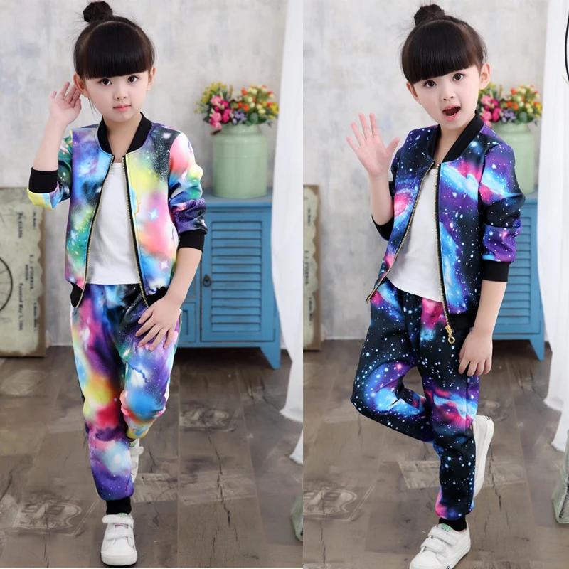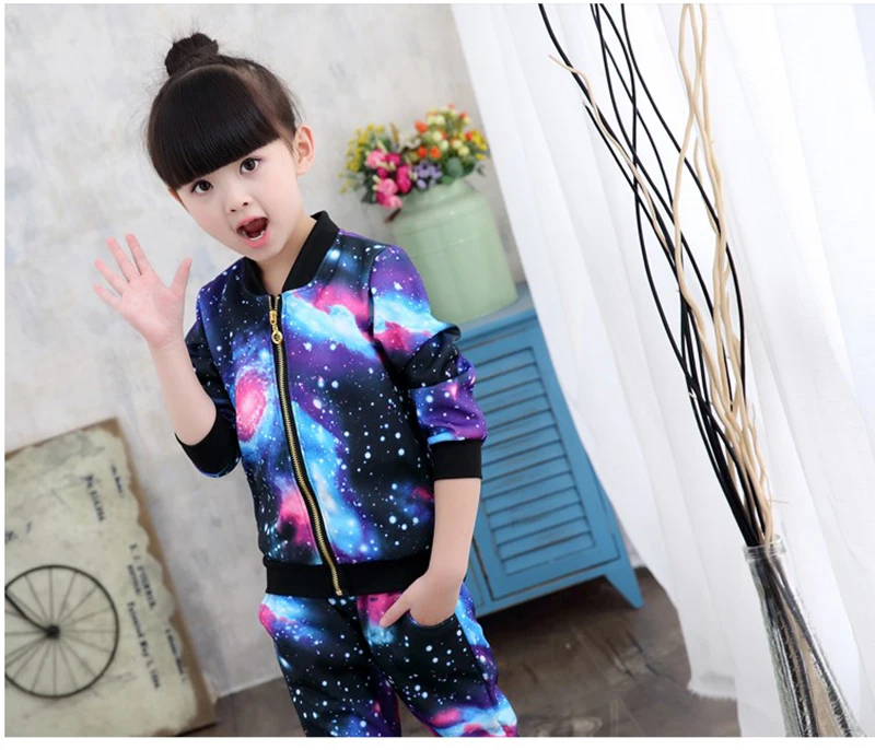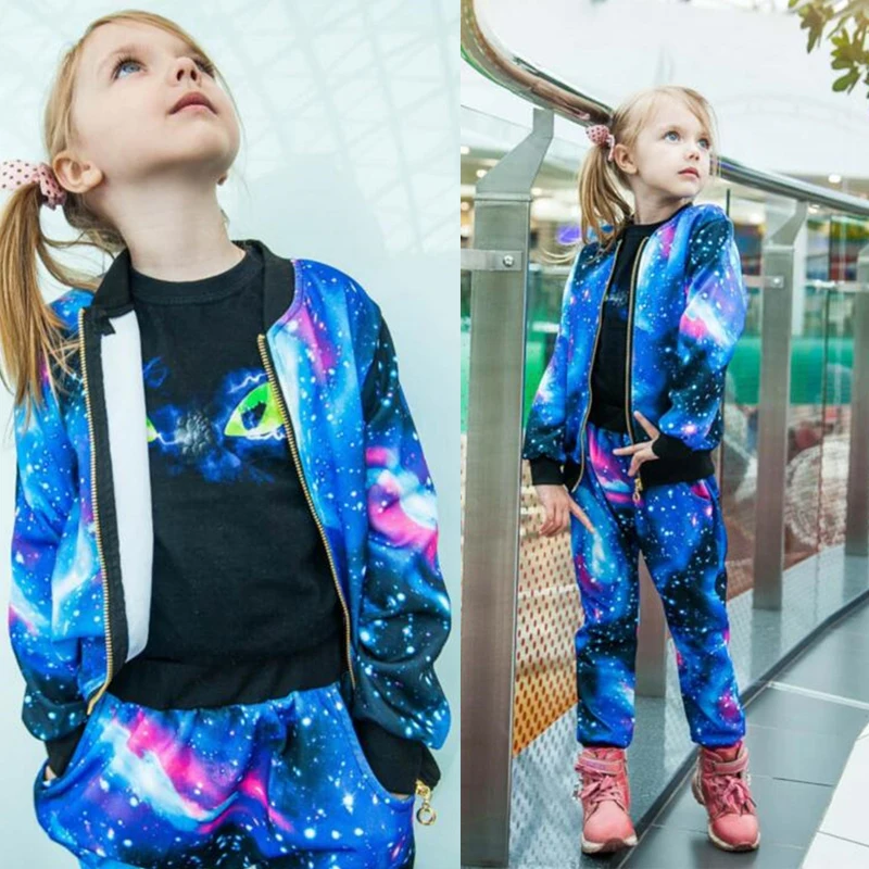 Комплекты одежды для девочек Вселенная модная куртка на молнии с капюшоном и звёздным небом на весну-осень и штаны Повседневный Спортивный костюм детская одежда От 2 до 10 лет
