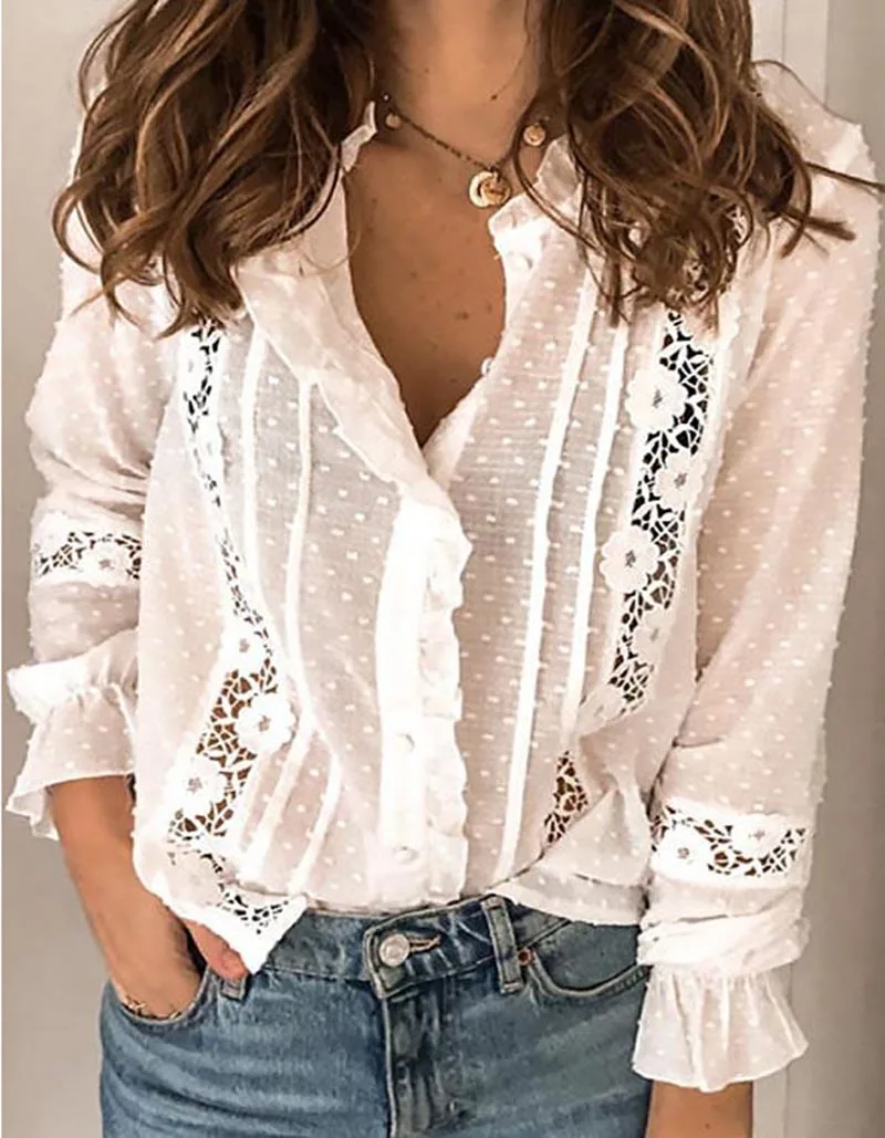 Женская кружевная блузка в стиле бохо, весенне-осенняя рубашка с оборками, сексуальный V-образный вырез, расклешенный длинный рукав, повседневные топы, 2020