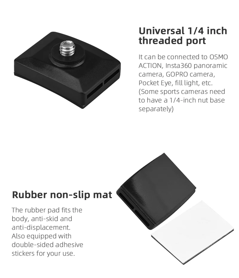 1. Изготовлен из высококачественных материалов, быстрый и прочный, износостойкий;2. Оснащен винтом 1/4, который может быть подключен к OSMO ACTION, панорамной камере Insta360, камере GOPRO, заполняющему светильник и т. д. (некоторые спортивные камеры должны подготовить адаптер отдельно);3. Длина кабеля составляет около 35 см, что подходит для большинства дронов. Длина кабеля может быть обрезана в соответствии с размером фюзеляжа во время установки. Легко установить и удобно.4. Резиновая противоскользящая накладка, подходит для корпуса, противоскользящая и противоскользящая. Также оснащен двусторонней лентой для использования.
