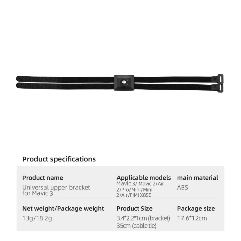 Материал: пластик,Применимые модели: для Mavic 2/3 / Air 2 / Pro / Mini / Air /Mini 2/ FIMI X8SE 2020 / Hubsan Zino,Цвет: черный,Вес нетто: 13 г,Вес посылка: 18,2 г,Продукт Размеры: 3,4*2,2*1 см (кронштейн), 35 см (кабельная стяжка)Посылка: 17,6*12 см.