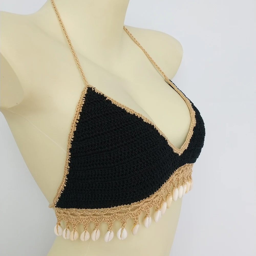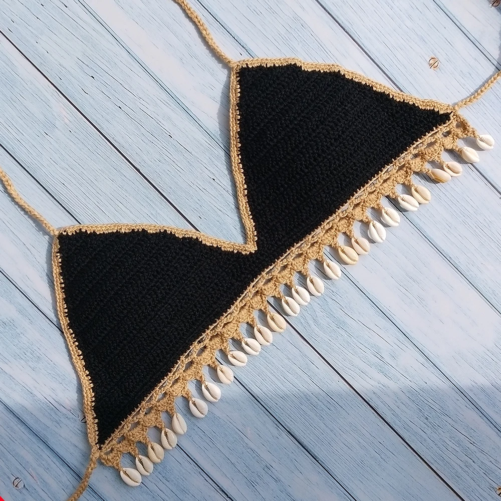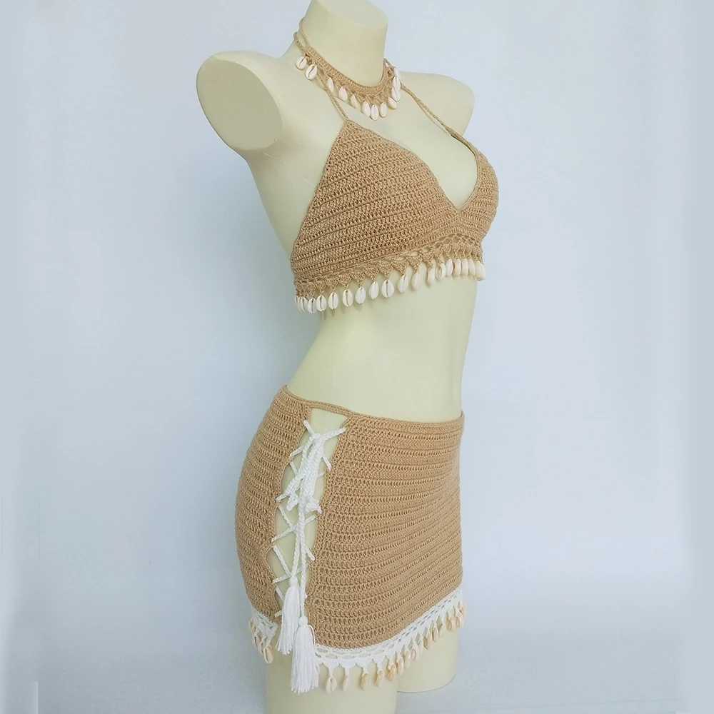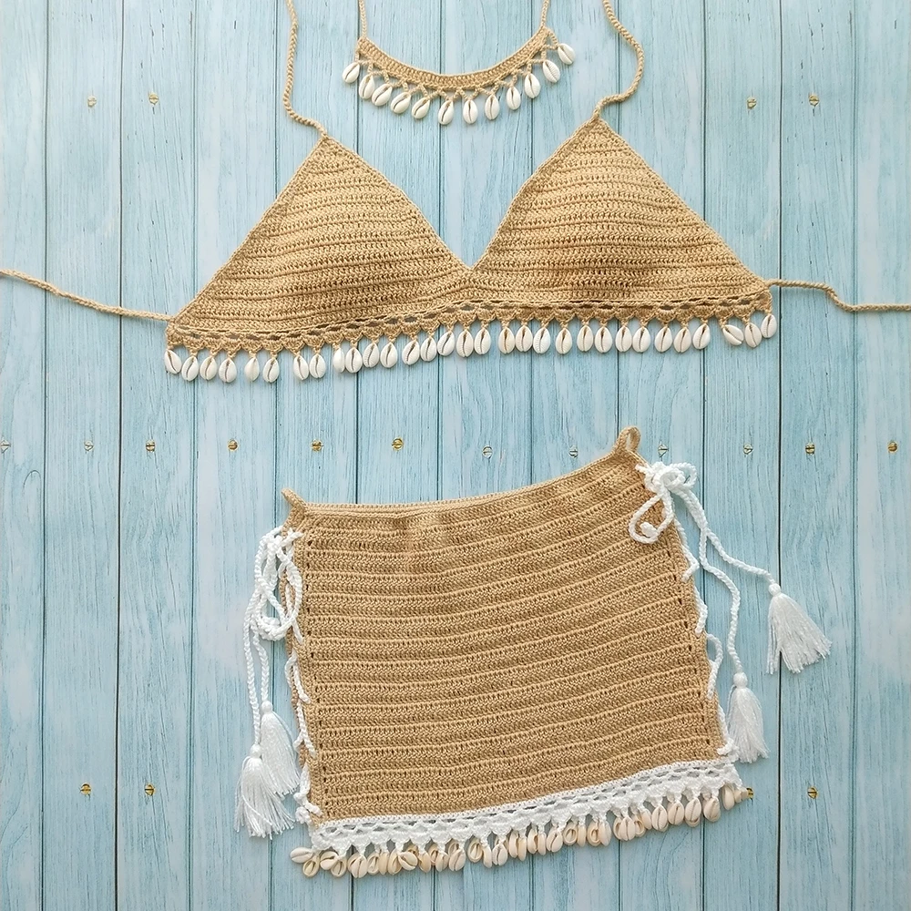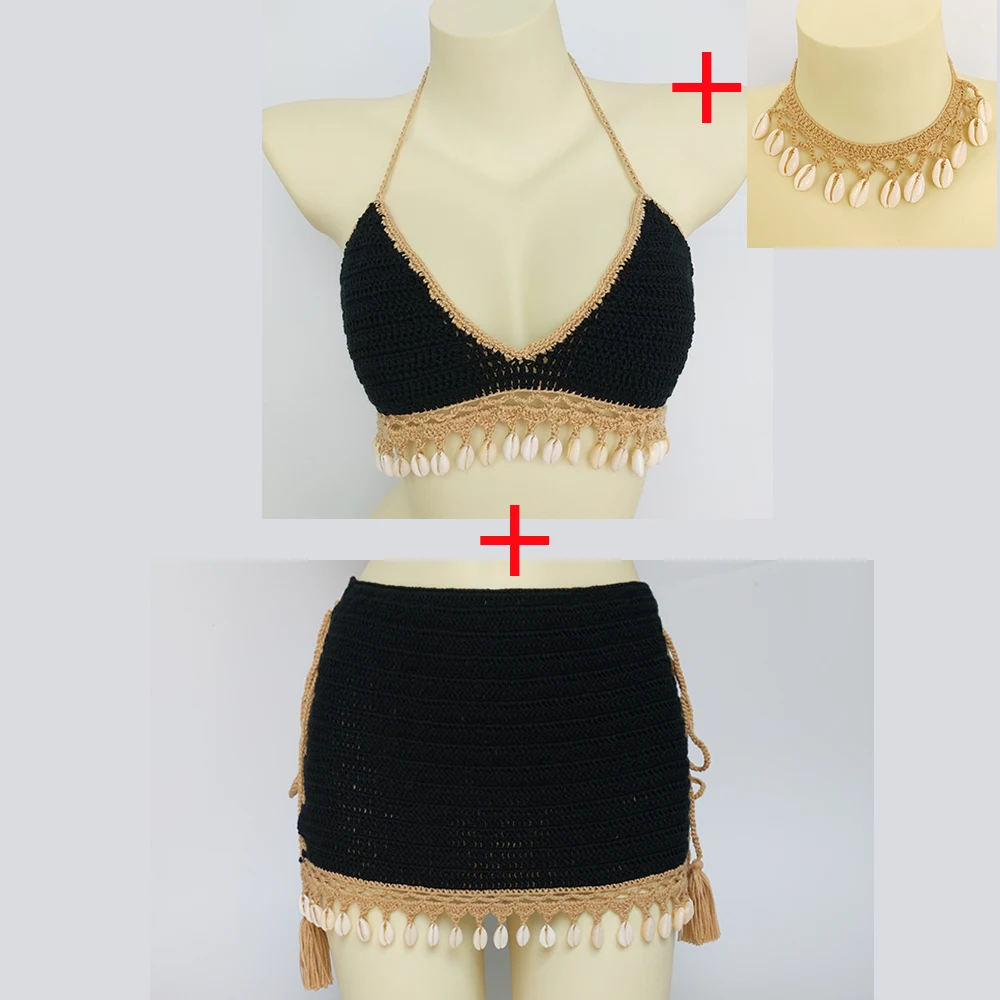 Комплект бикини женский из 3 предметов, модный вязаный комплект бикини с бахромой, пикантное пляжное платье, кружевная мини-юбка и ожерелье из ракушек
