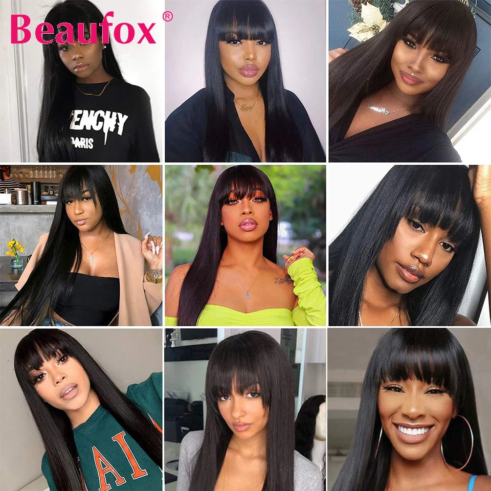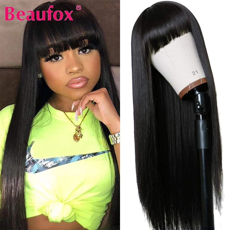 Прямые человеческие волосы парики с челкой малазийские человеческие волосы парики для женщин Remy Glueless Полный машинный парик с бахромой челка Beaufox