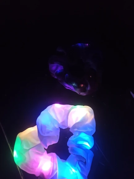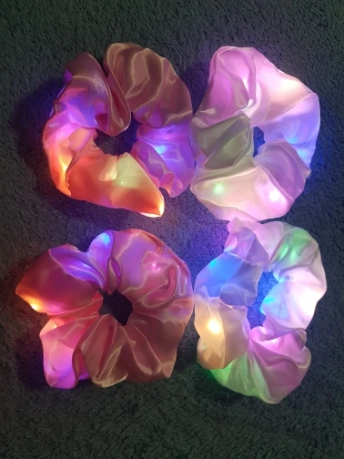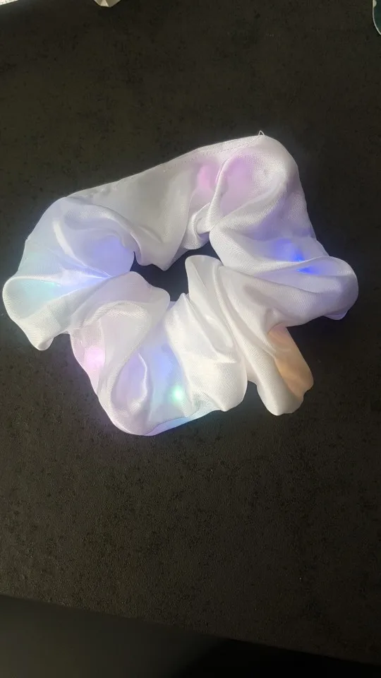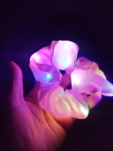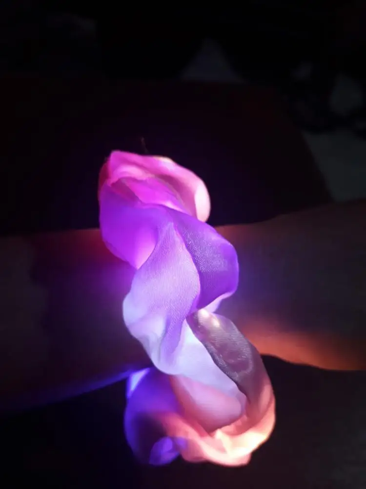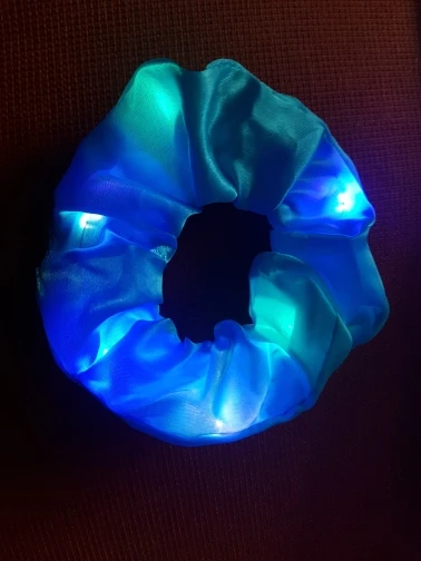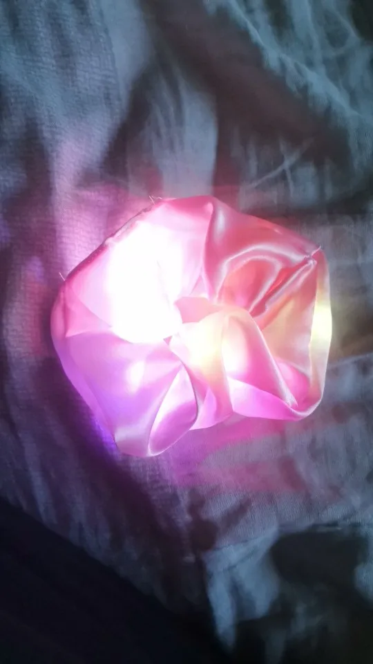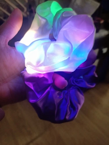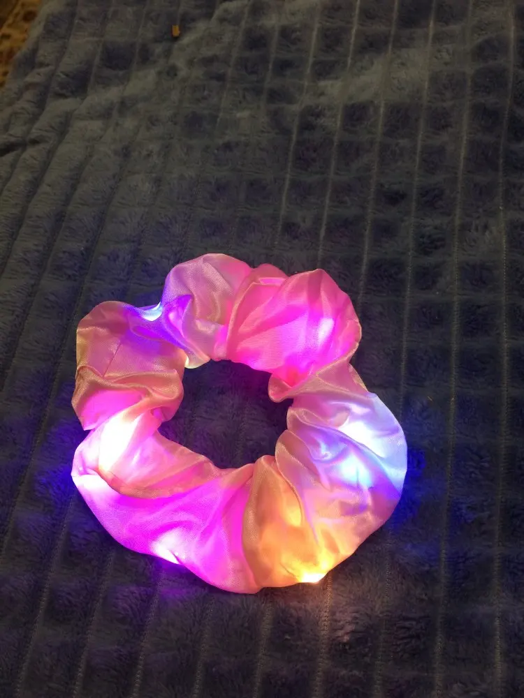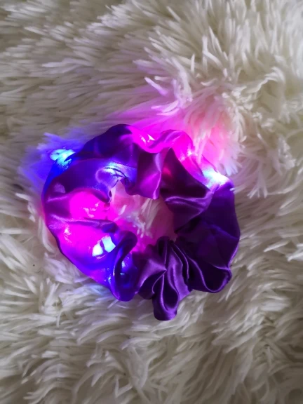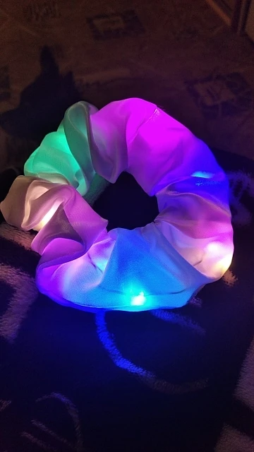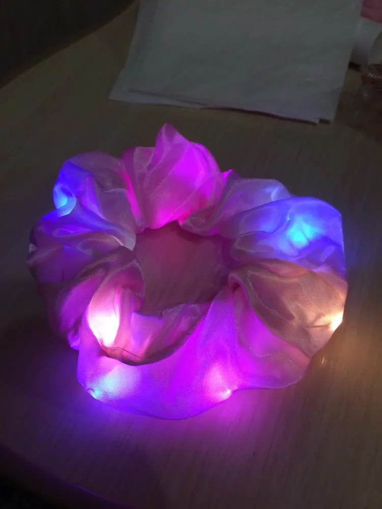 Сама резинка сделана из тонкой атласной ткани,внутри тонкие провода и переключатель (есть три режима мигания,как на гирлянде новогодней),запаха нет,доставка до СПб почти 2 месяца.В общем то как украшение к прическе неплохо,но как резинкой полноценной конечно быть не может.