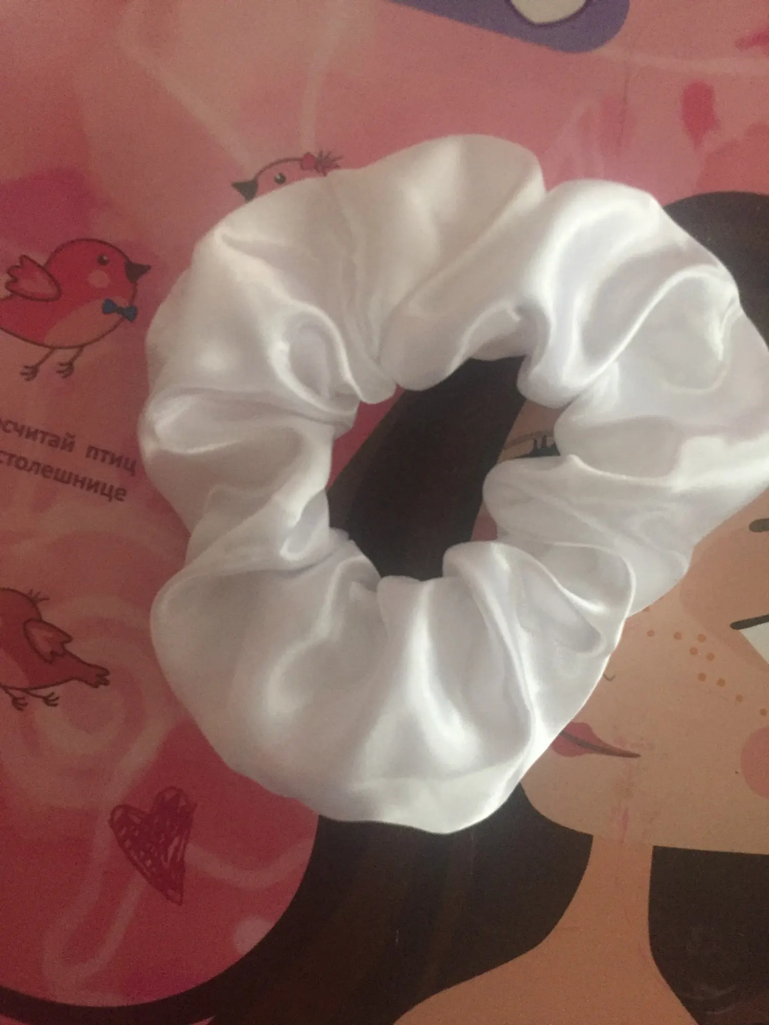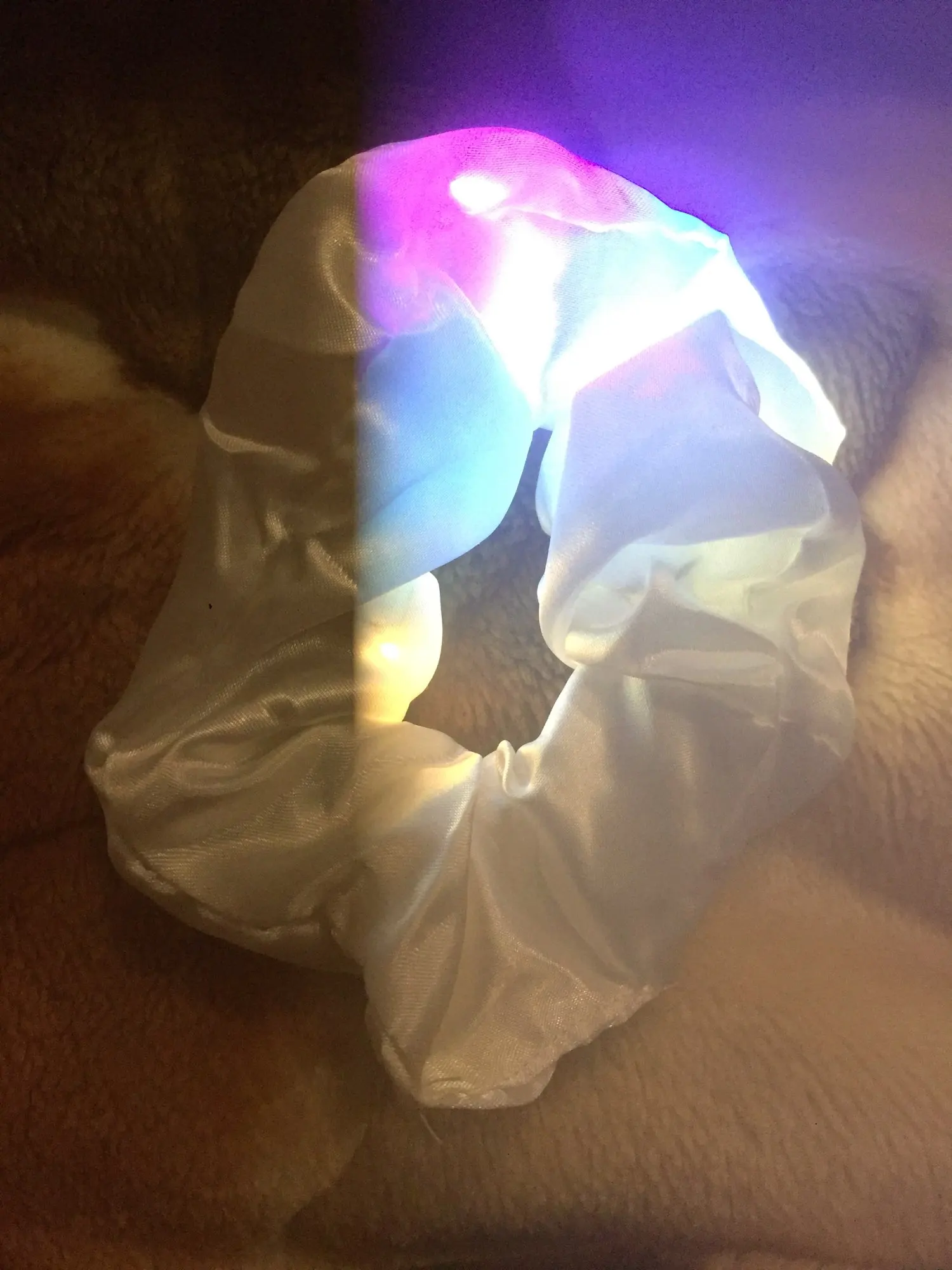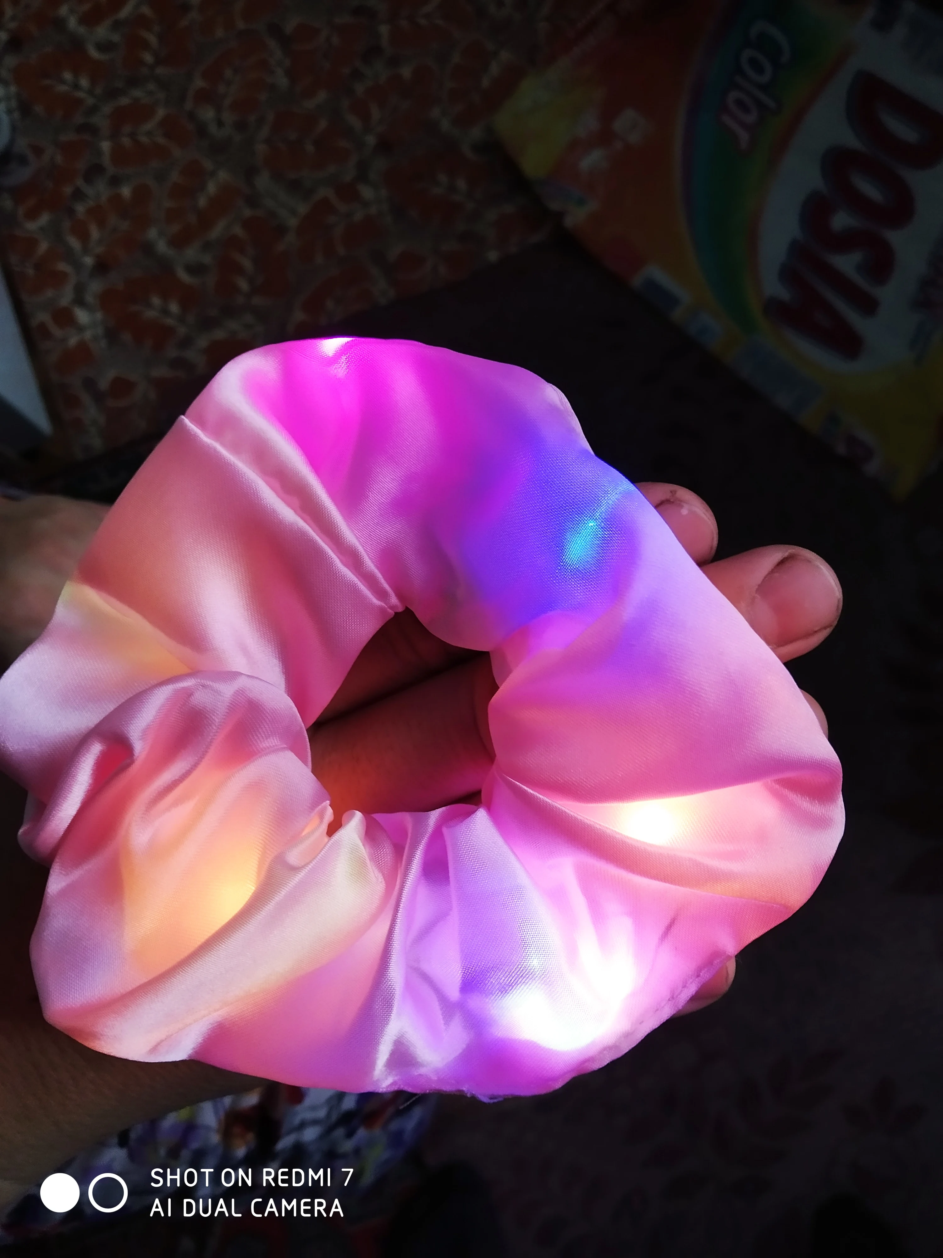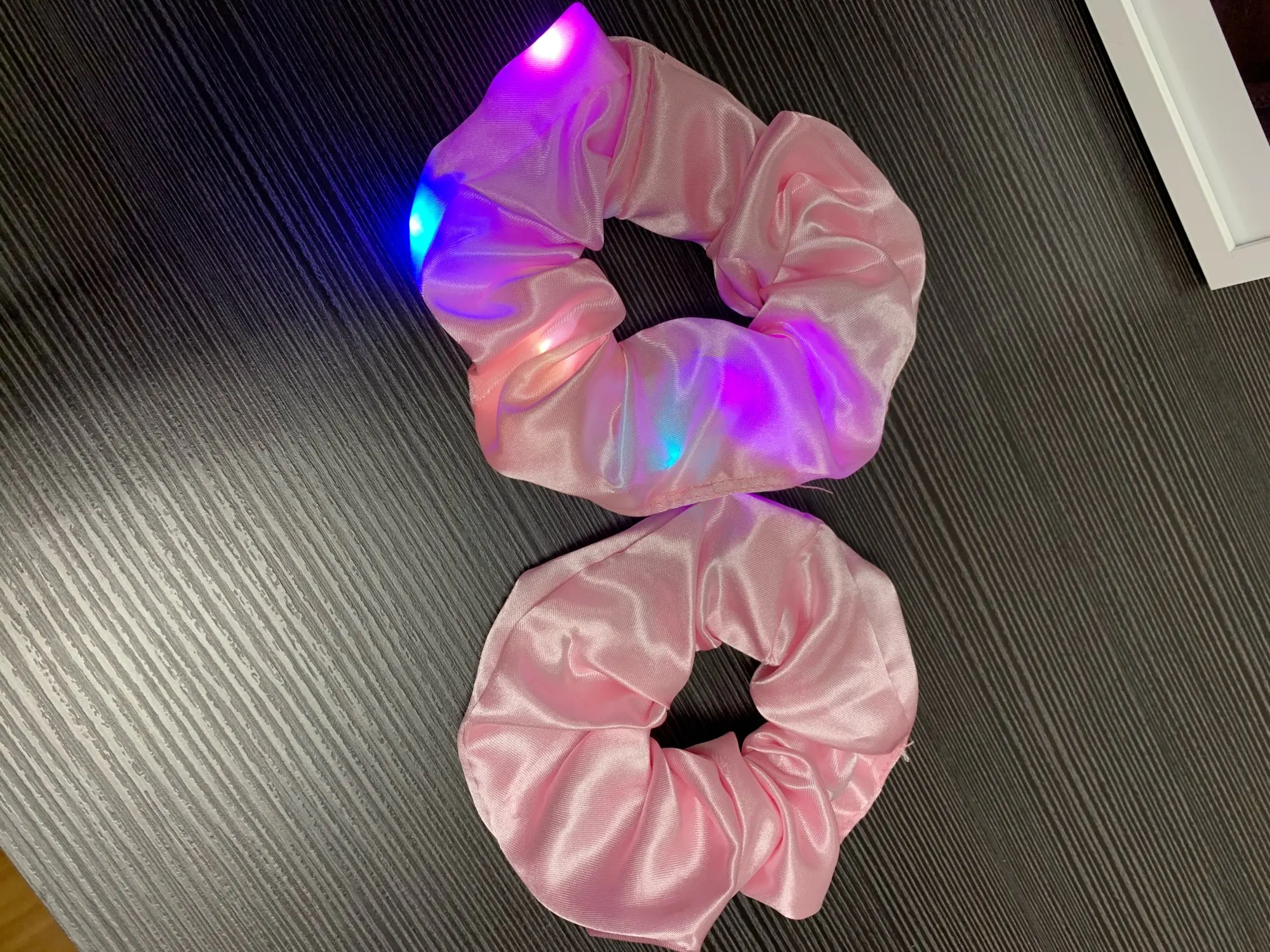 Сама резинка сделана из тонкой атласной ткани,внутри тонкие провода и переключатель (есть три режима мигания,как на гирлянде новогодней),запаха нет,доставка до СПб почти 2 месяца.В общем то как украшение к прическе неплохо,но как резинкой полноценной конечно быть не может.