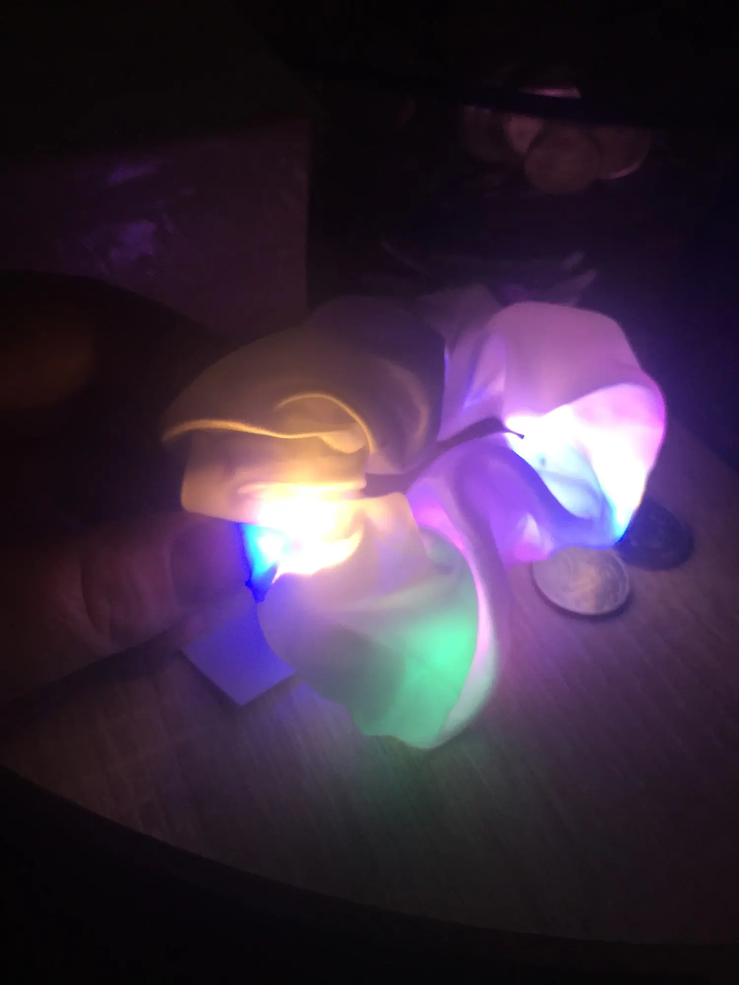 В начале когда я ещп не распокавала посвлку я думала что там типо как батарейка когда открыла там было резинка но воопщем я довольна но есть одно но то что тут половина светится а половина нет( тут еще 3 режима а так все супер