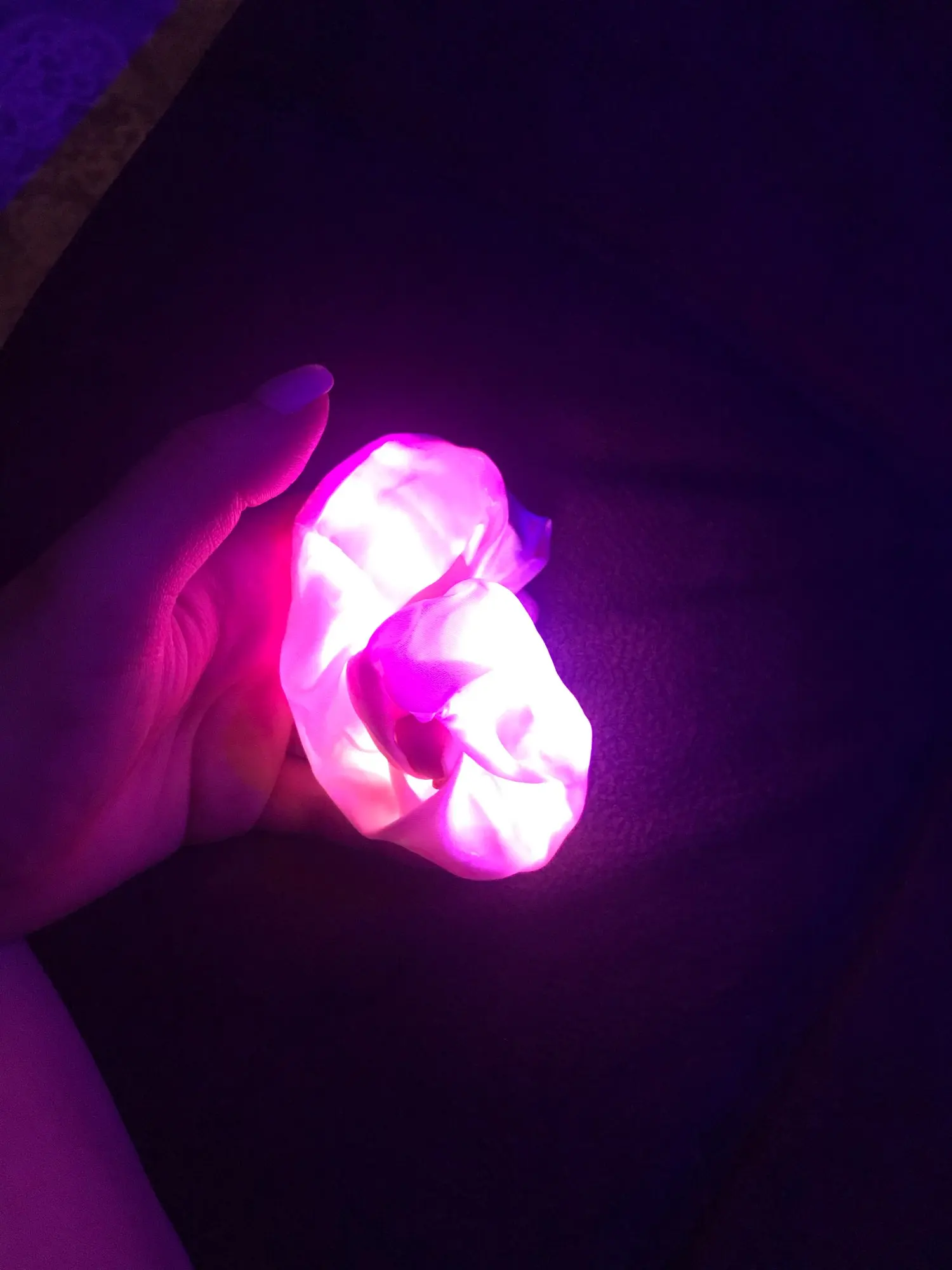 Немного разочарована. Резинка тёмно сиреневого цвета. Чтобы включить, пришлось распороть шов. В переключателе был стопор. Светит очень слабо. в темноте еле видно. Видимо из-за плотного материала. Так себе... С продавцом не общалась. Товар шёл почти 2 м-ца.