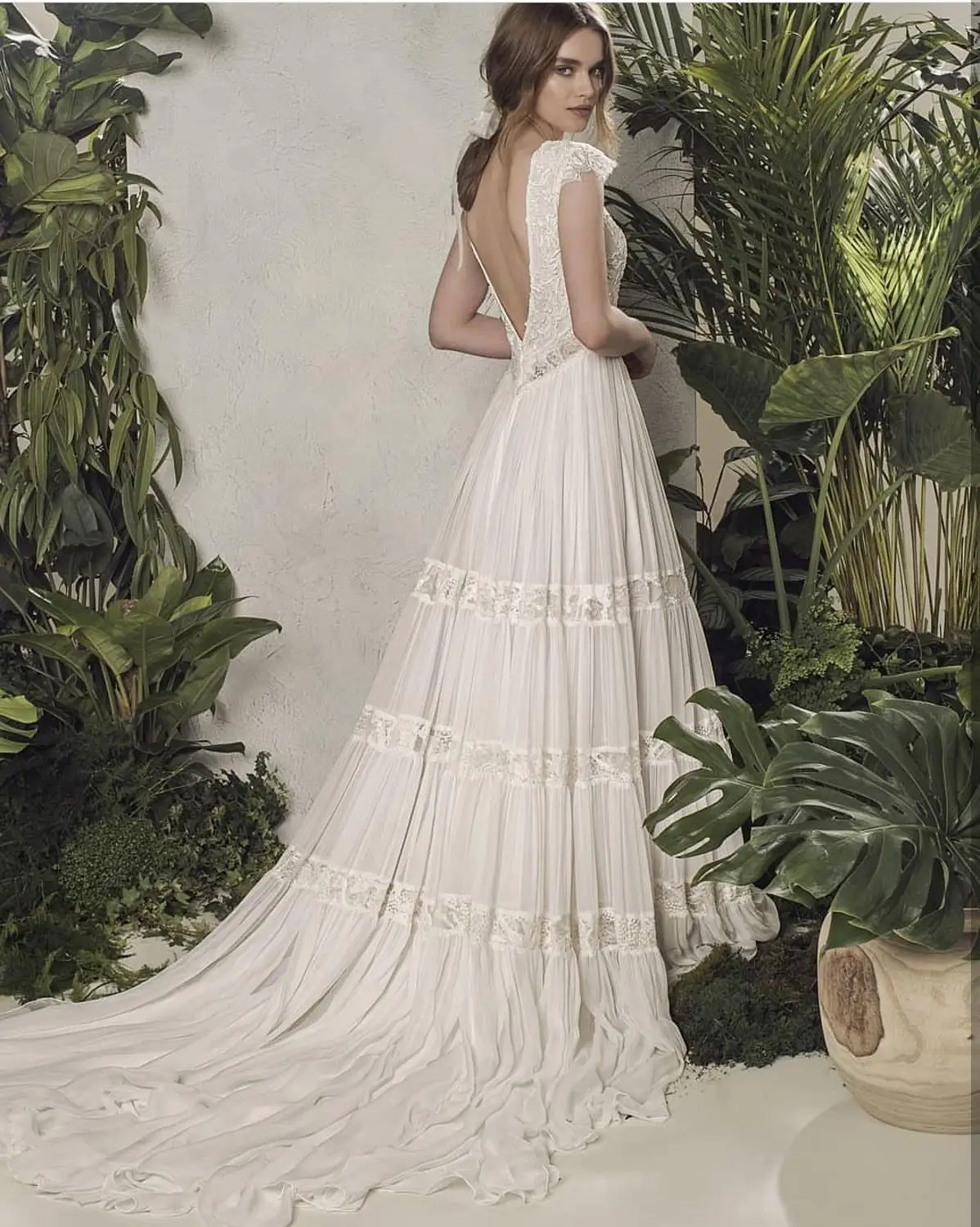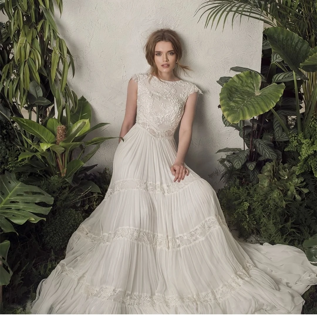 Женское свадебное платье с открытой спиной, кружевное простое платье-трапеция до пола с круглым вырезом и аппликацией, очаровательное платье со шлейфом в стиле бохо, 2021