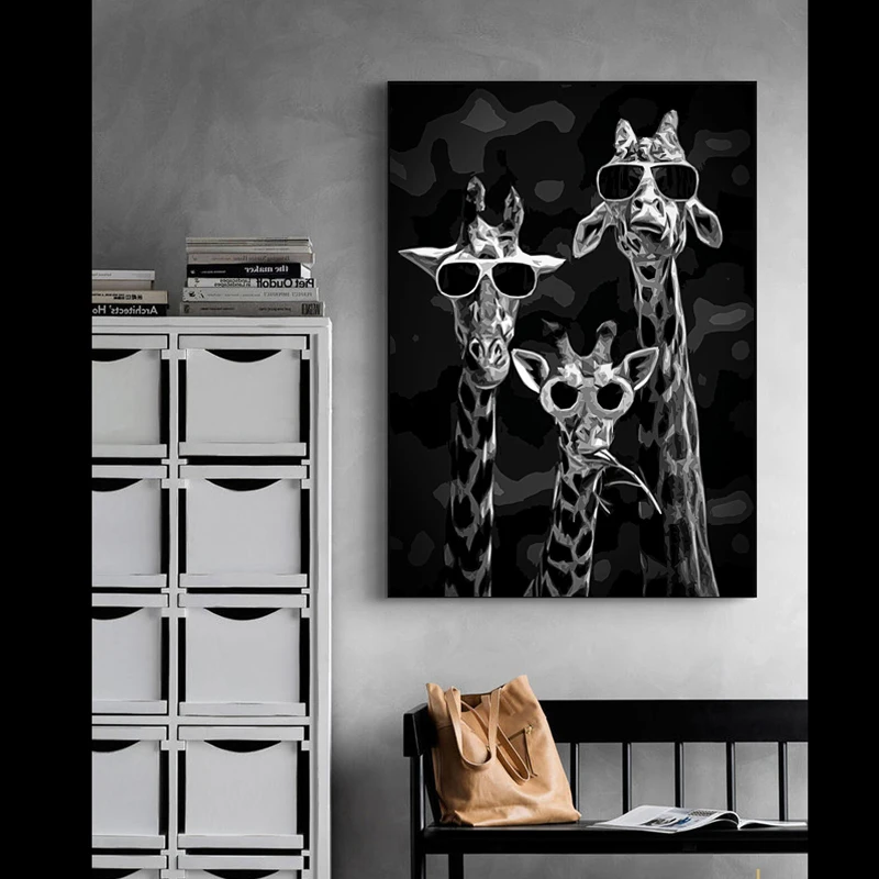 Картина на холсте с изображением жирафов в очках, черных животных