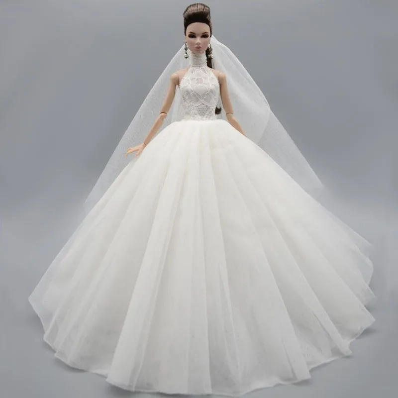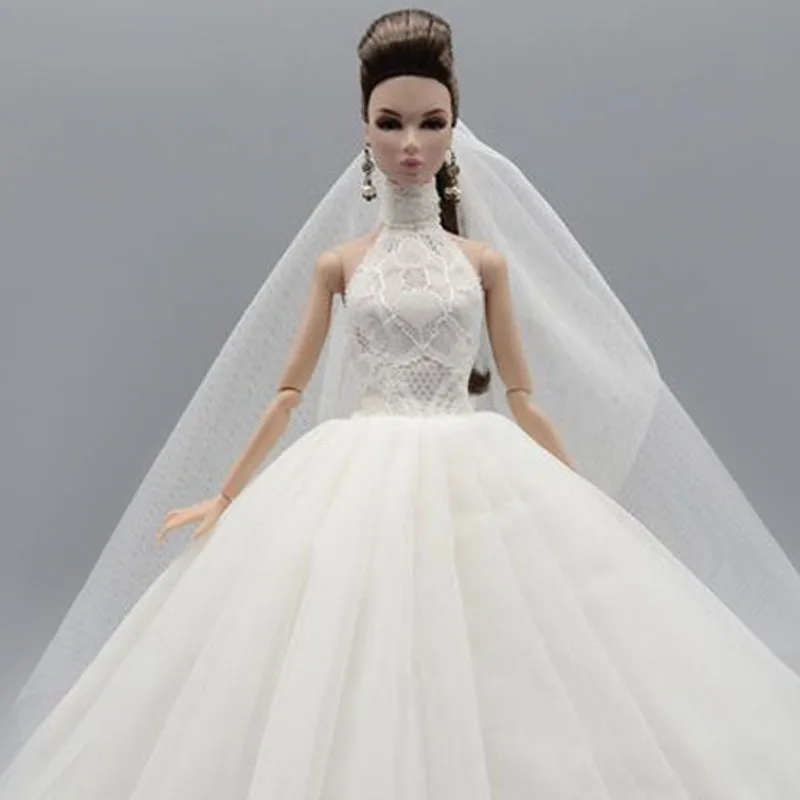 Белое модное свадебное платье с высоким воротом для куклы Барби, наряды принцессы, Вечернее Длинное нарядное платье, платья, Одежда для кукол и вуаль