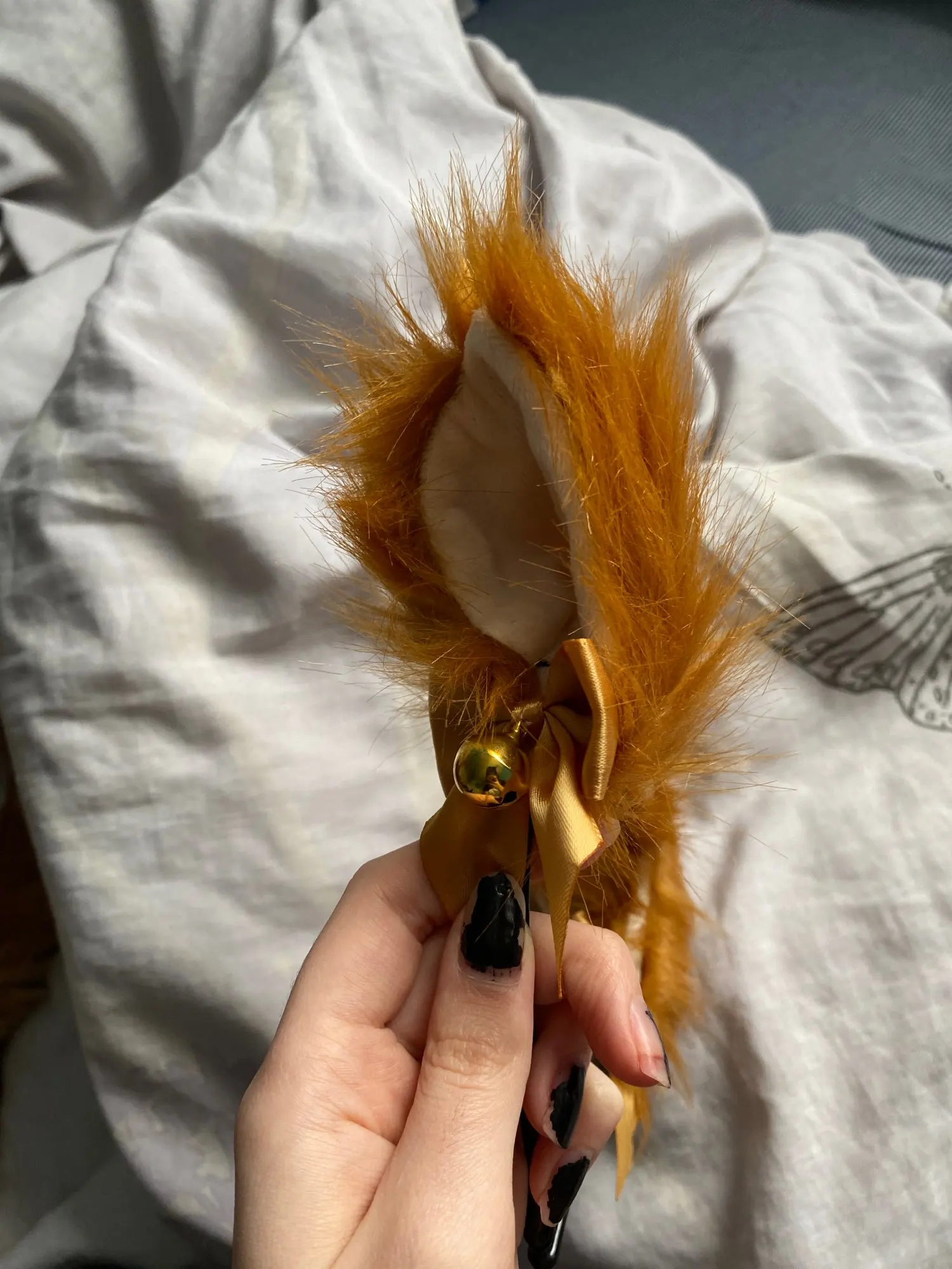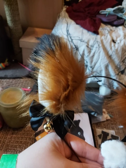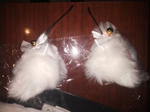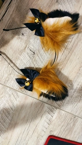 в точности как на фотографии, бубенцы хорошо звенят, мех мягкий, пришло примерно за месяц, ободок отличный, ушки передвигаются по ободку, но они немного разные, но это скорее даже хорошо