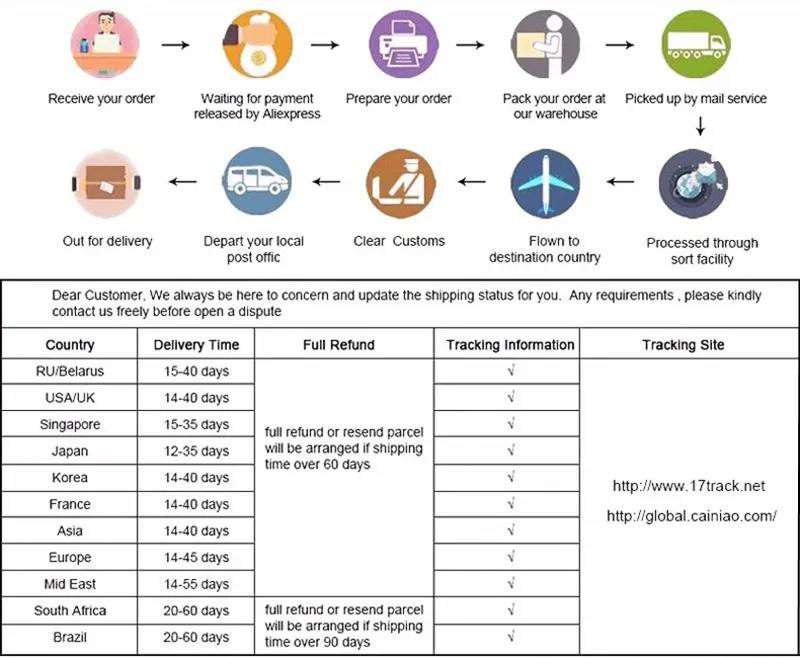1. Все товары будут отправлены в течение 1-7 дней после получения оплаты.2. Груз будет отправлен почтой Китая или ePacket. Если требуется доставка DHL,Fedex,EMS,UPS и TNT (около 3-8 дней), пожалуйста, дайте мне знать.3. Доставка на вашу сторону займет 15-60 рабочих дней. Различные места прибытия, разные способы логистики и сроки доставки, пожалуйста, обновите фактическую логистическую информацию как стандартную!