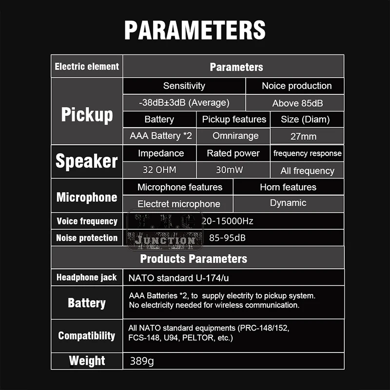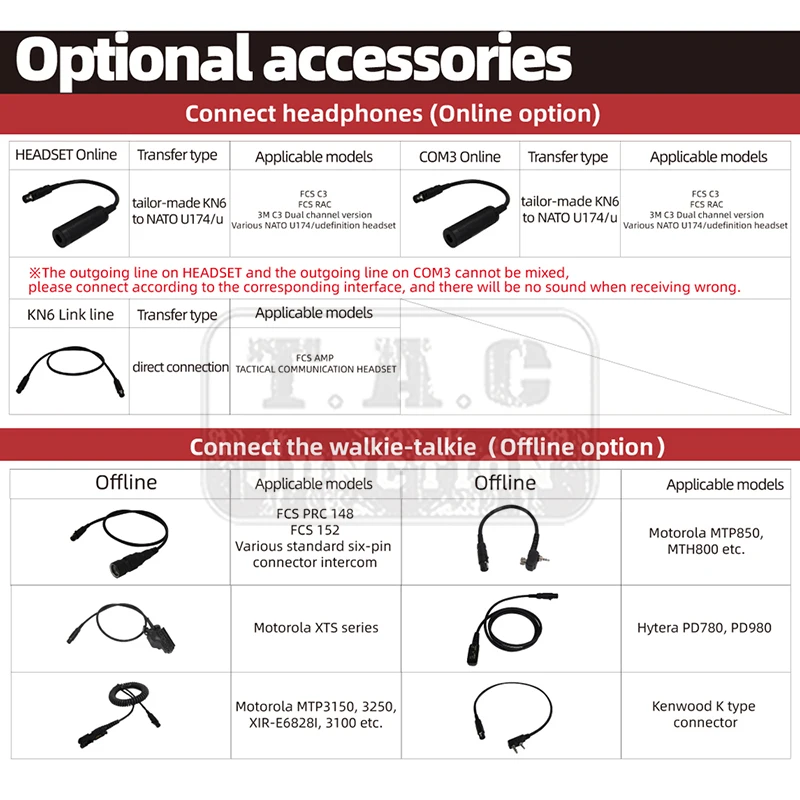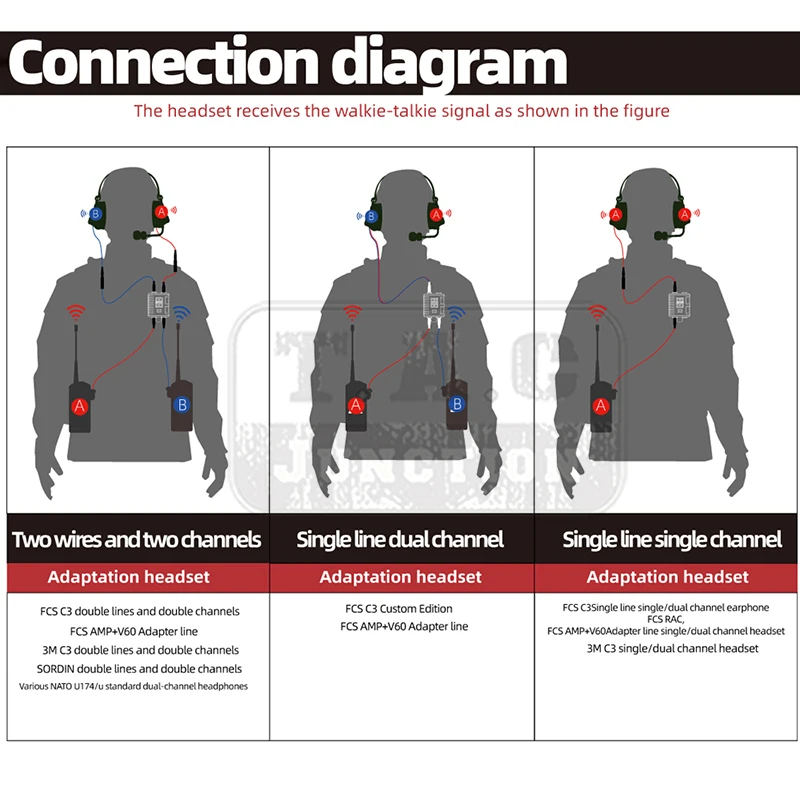 • Совместимость с Comtac3 гарнитура, чехол в стиле AMP + V60 разъем, 3 м C3 гарнитура, гарнитура Sordin, Стандартный U285/U два прохода гарнитуру.