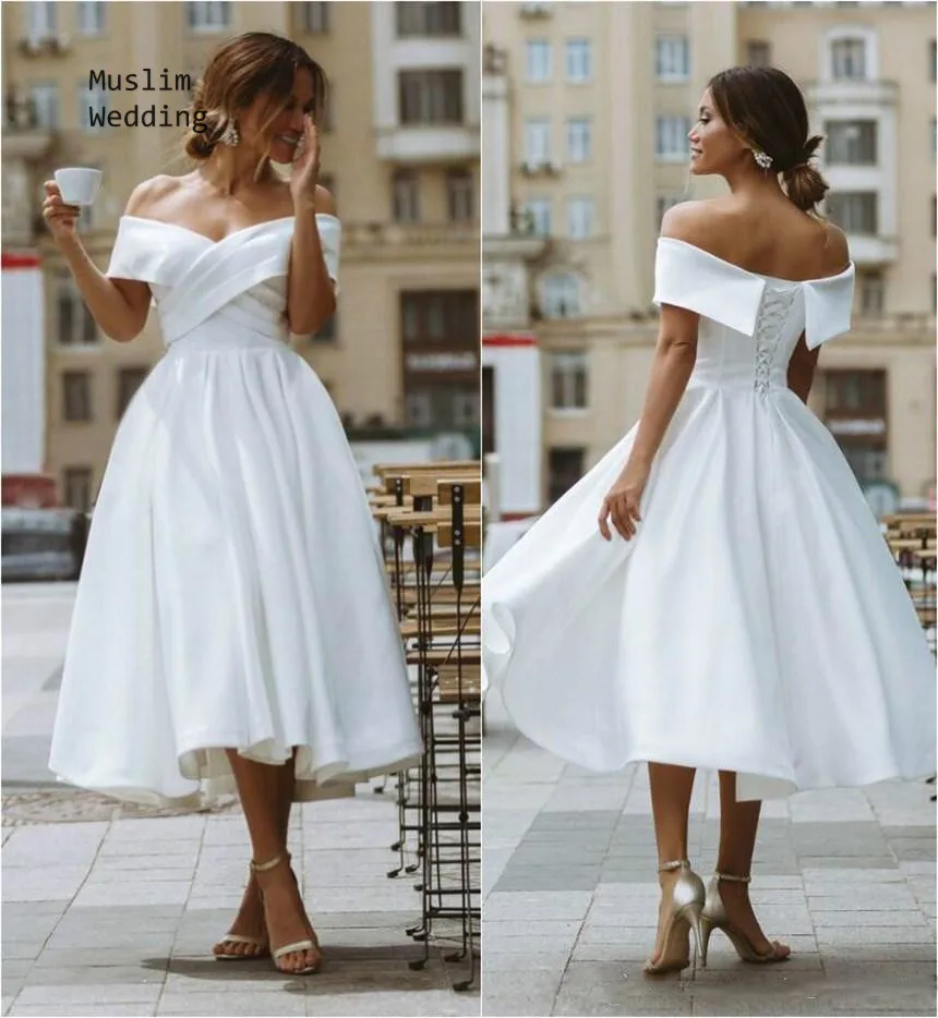 Атласное Короткое свадебное платье-трапеция, с открытыми плечами, длиной до щиколотки, недорогое свадебное платье в стиле бохо, свадебные юбки в стиле хиппи, 2020