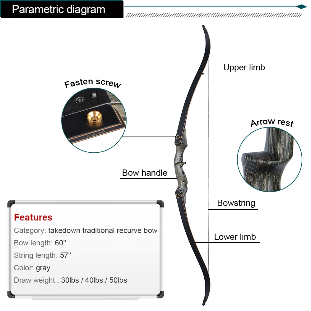 Стрельба из лука, изогнутый лук 60 дюймов, 304050 фунтов, ламинированный, с деревянными конечностями, углеродная стрела для занятий спортом на открытом воздухе, охоты, стрельбы для взрослых