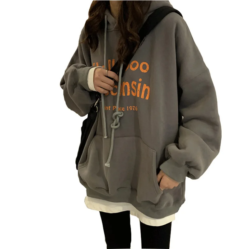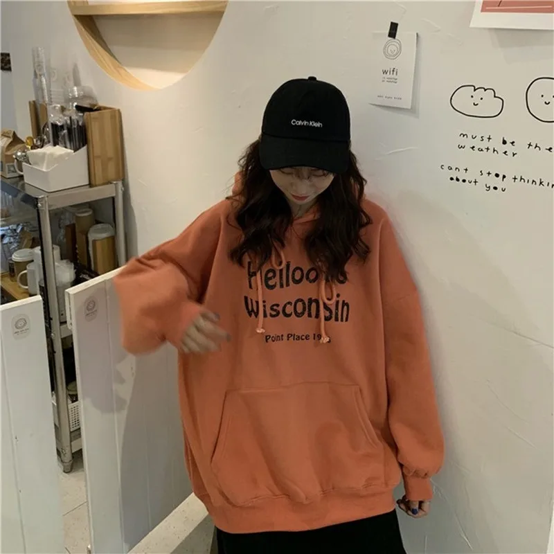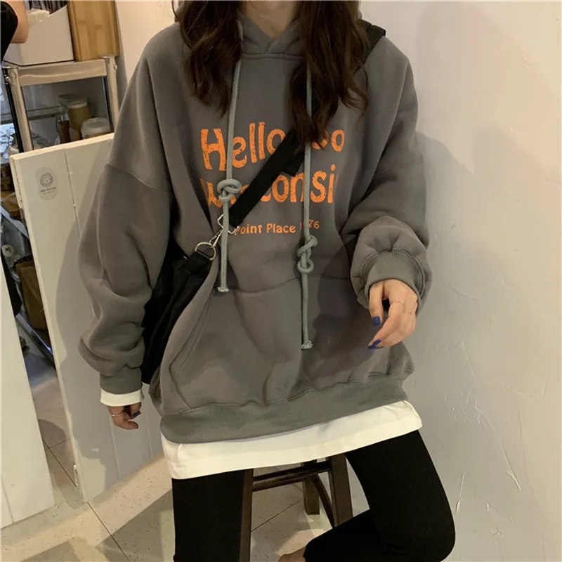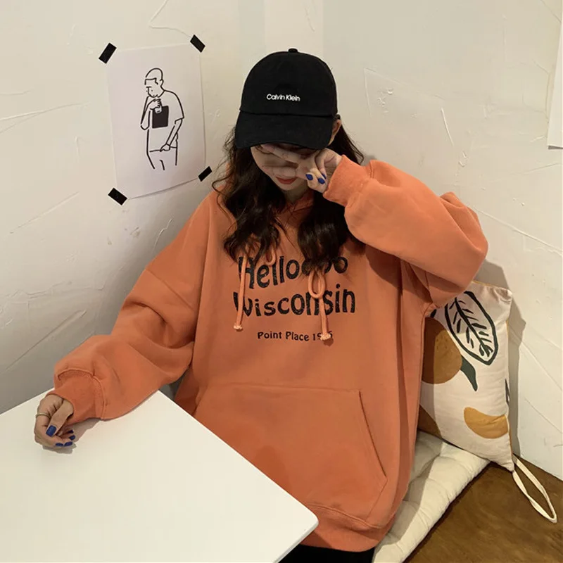Женская толстовка с капюшоном, осенняя, оранжево-серая, свободная, повседневная, с длинным рукавом, 2020