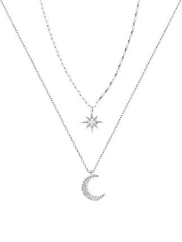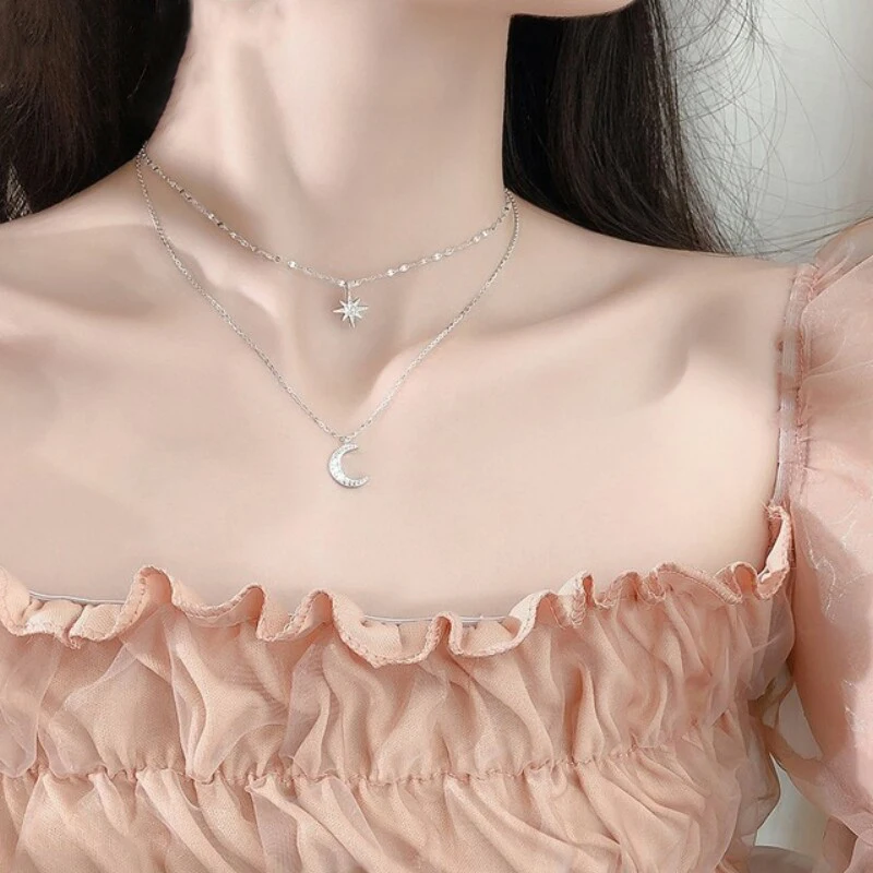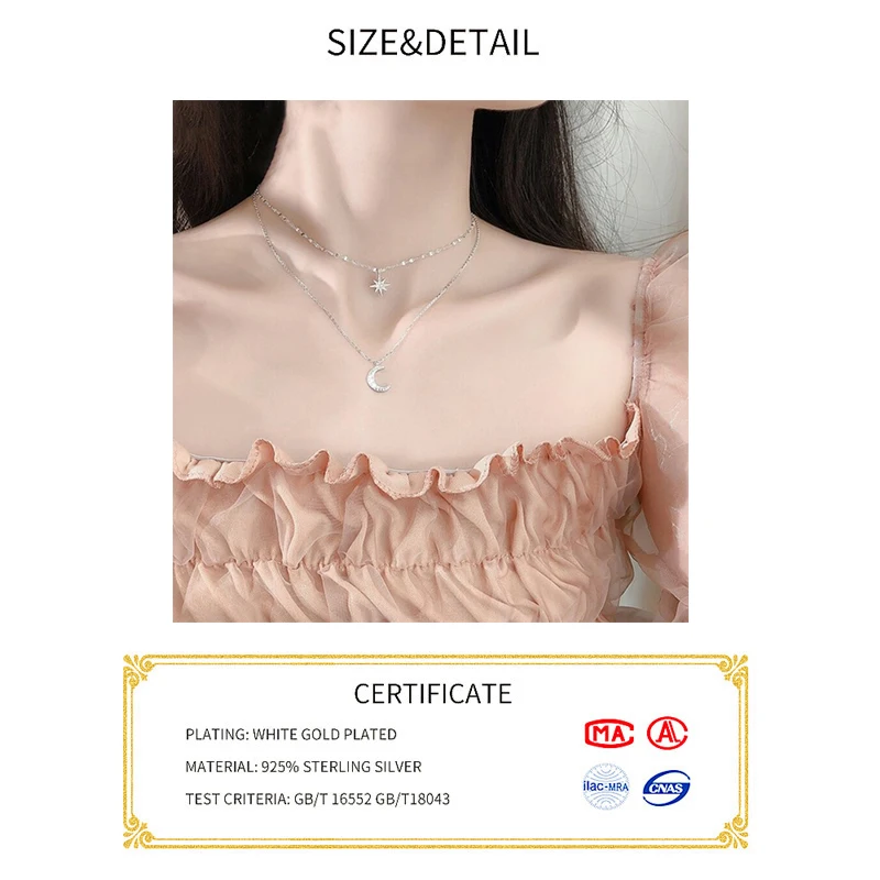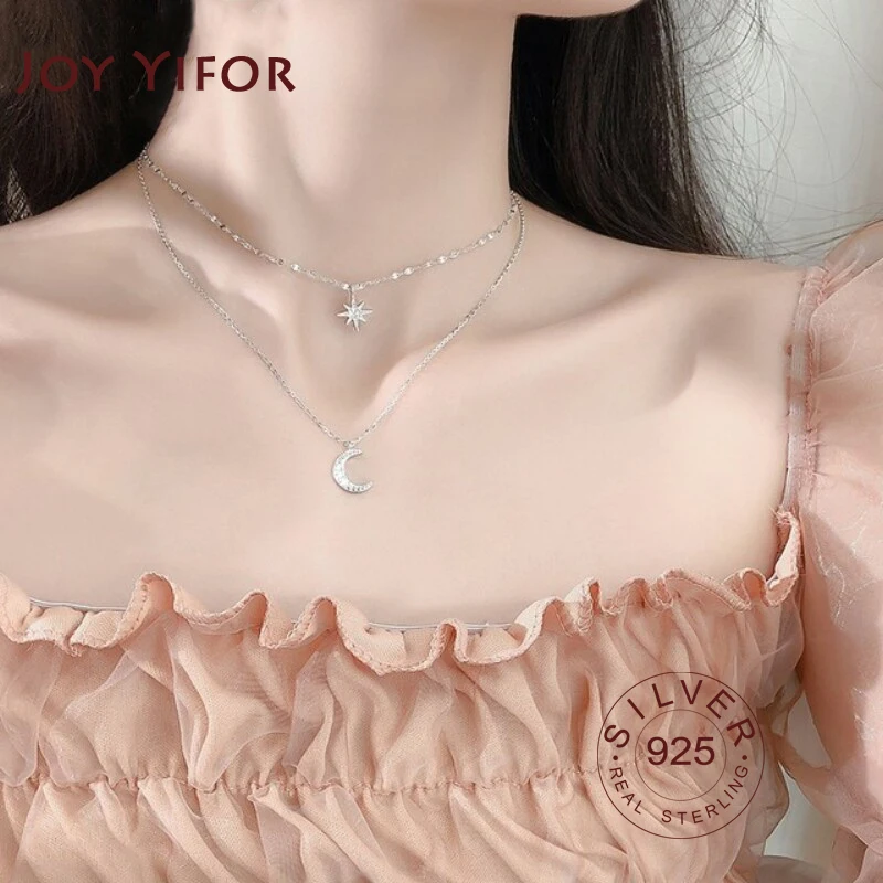 925 серебро двойной Слои с изображением луны и звезд, цепочка с кулоном, Цепочки и ожерелья для Для женщин девочек фианит Цепочки и ожерелья подарок