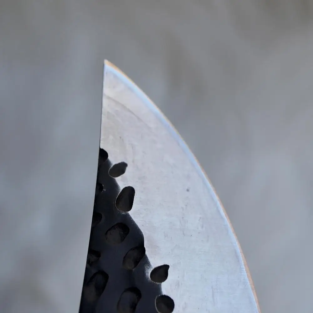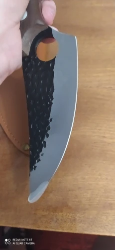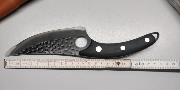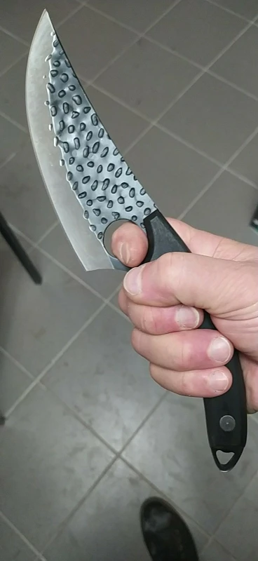 нож приятно удивил, лезвие толстое, сам нож довольно тяжёлый, сделан качественно, заточка очень острая, нарезал замороженное мясо удобно, режится легко