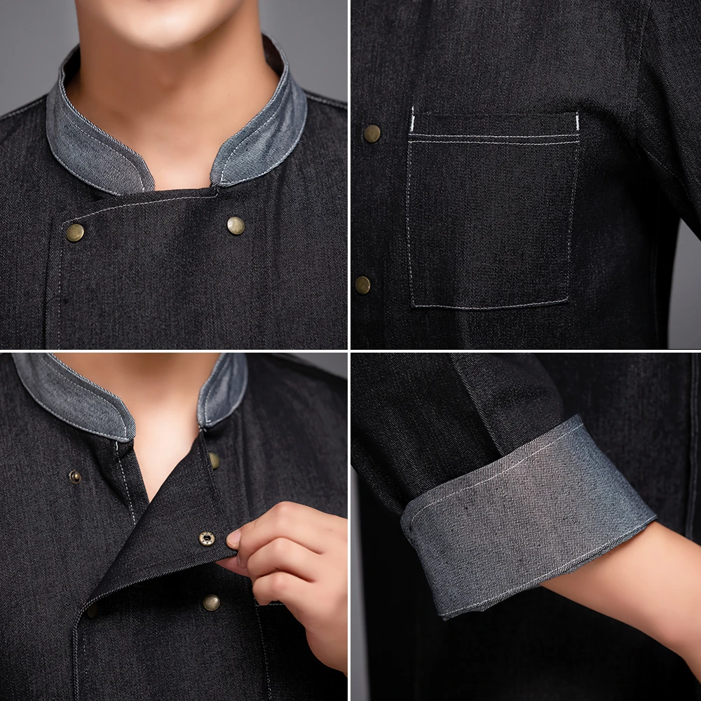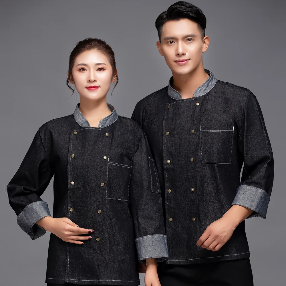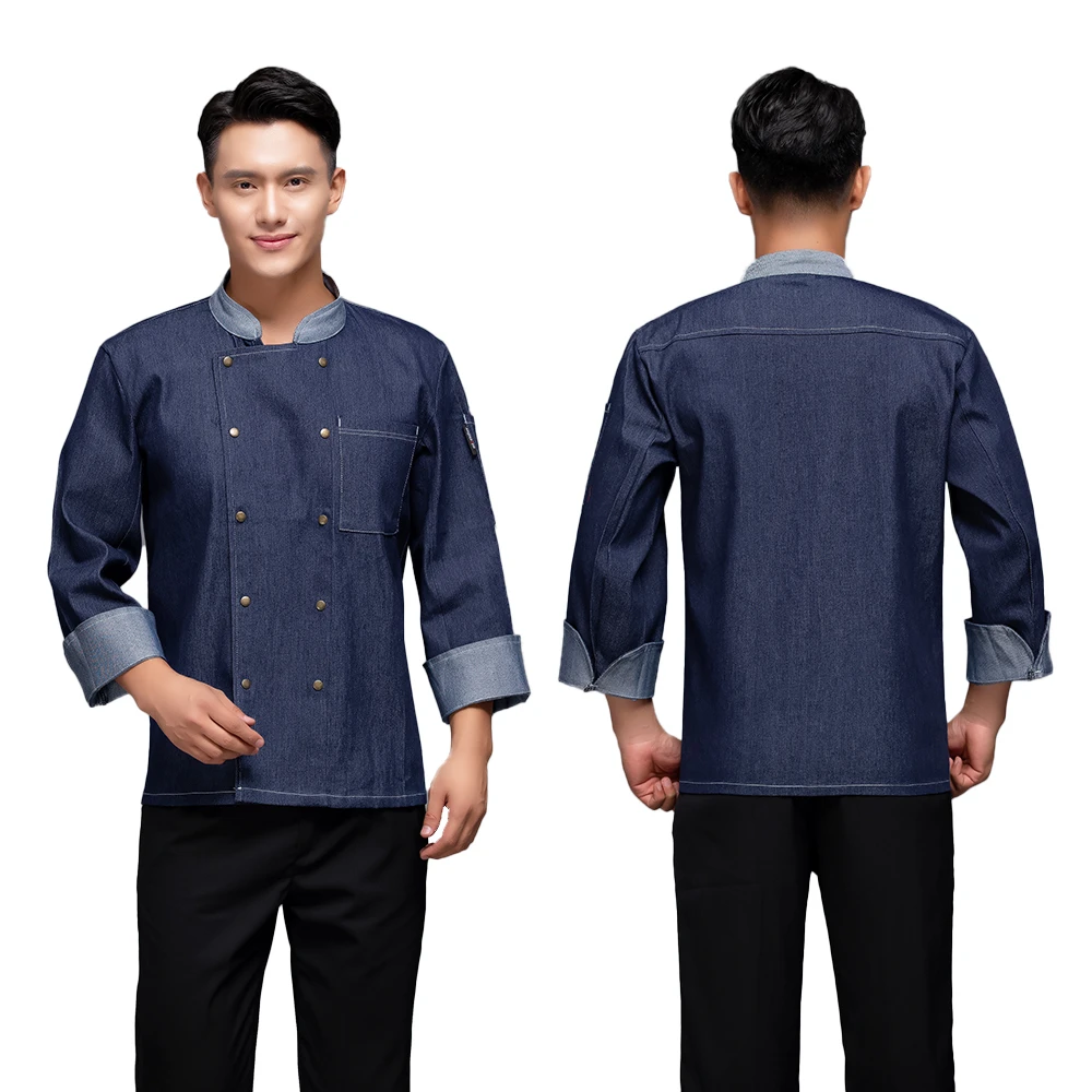 Плотная джинсовая форма шеф-повара с длинным рукавом для еды, шеф-повара, пальто, шляпа, фартук, для ресторана, кухни, повара, рубашки для мужчин, женщин, мужчин, шеф-повара, куртки