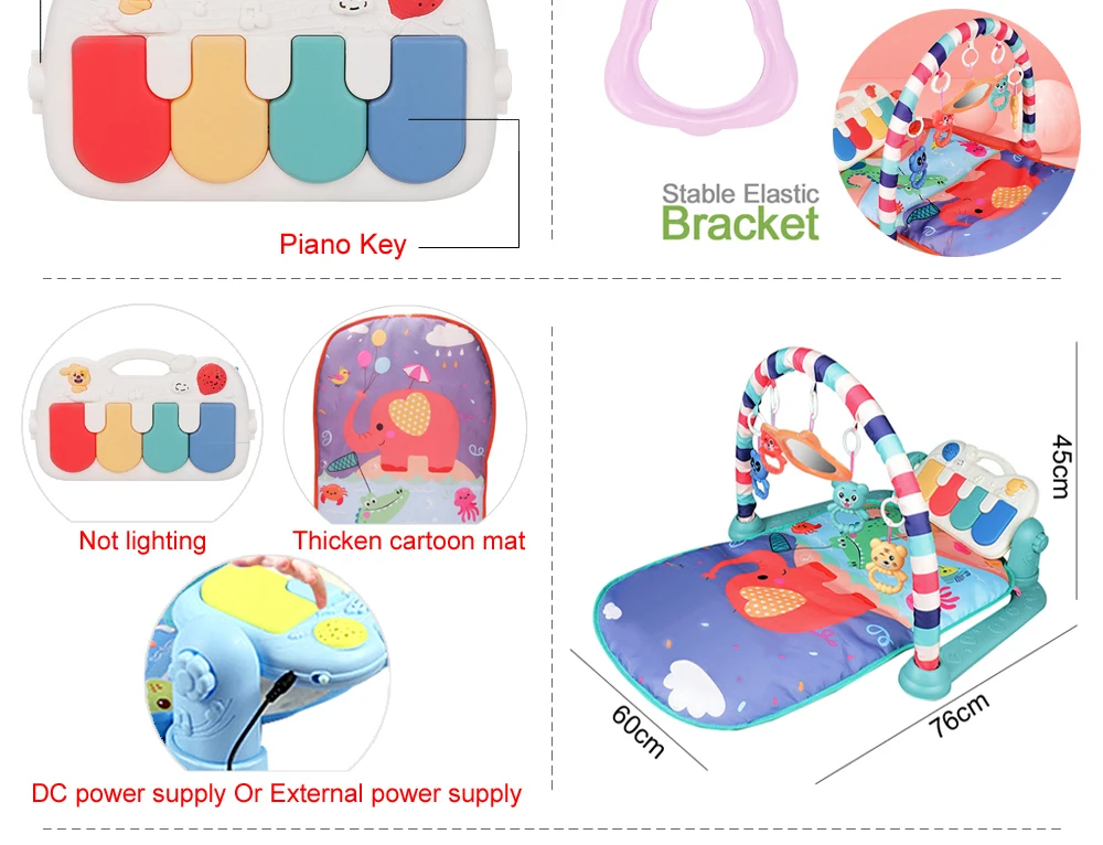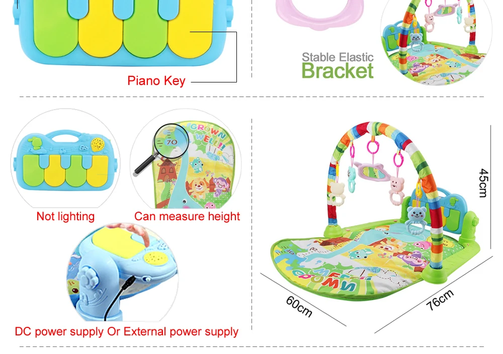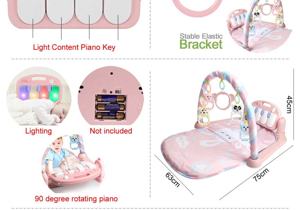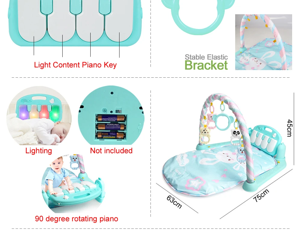 Название продукта: детский игровой коврикМатериал: хлопок, пластикРазмер коврика: 75*63*45 смДля пианино требуется батарея 3*1,5 в AA (не входит в комплект)