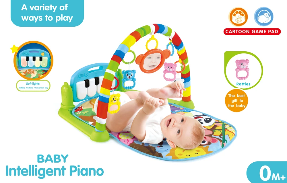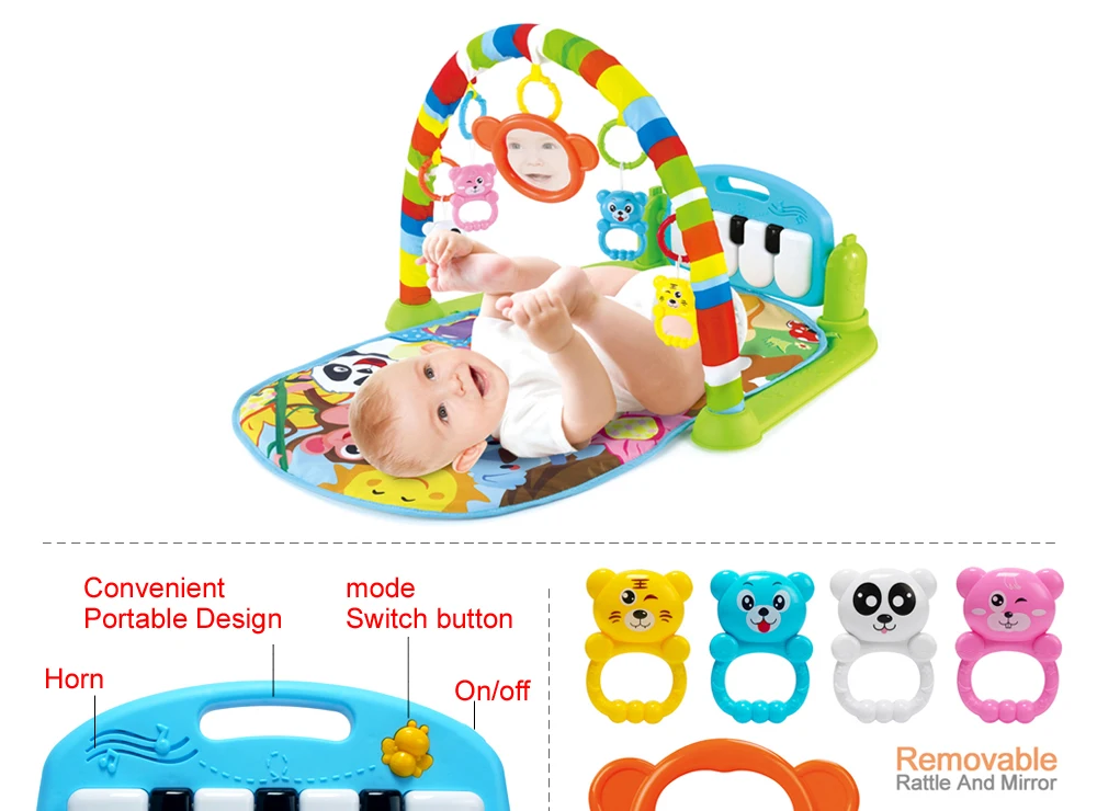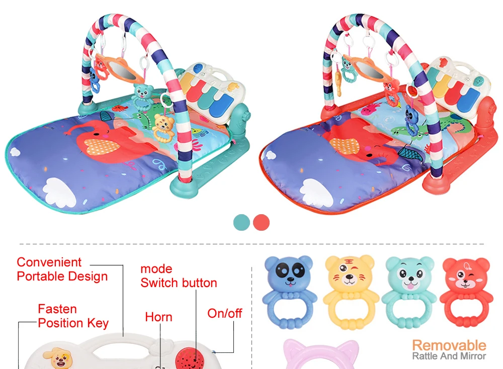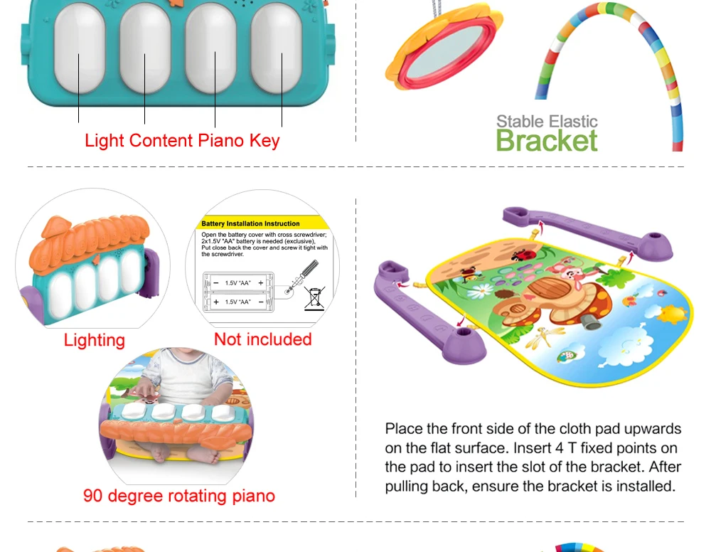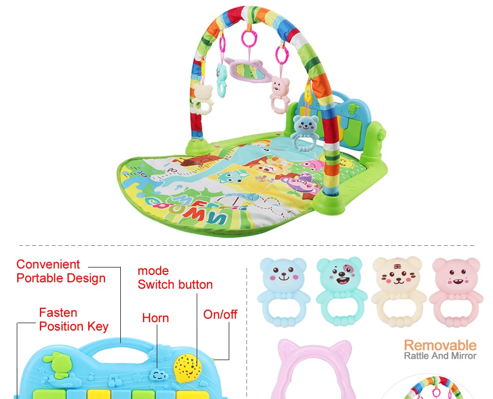 Название продукта: детский игровой коврикМатериал: хлопок, пластикРазмер коврика: 75*63*45 смДля пианино требуется батарея 3*1,5 в AA (не входит в комплект)