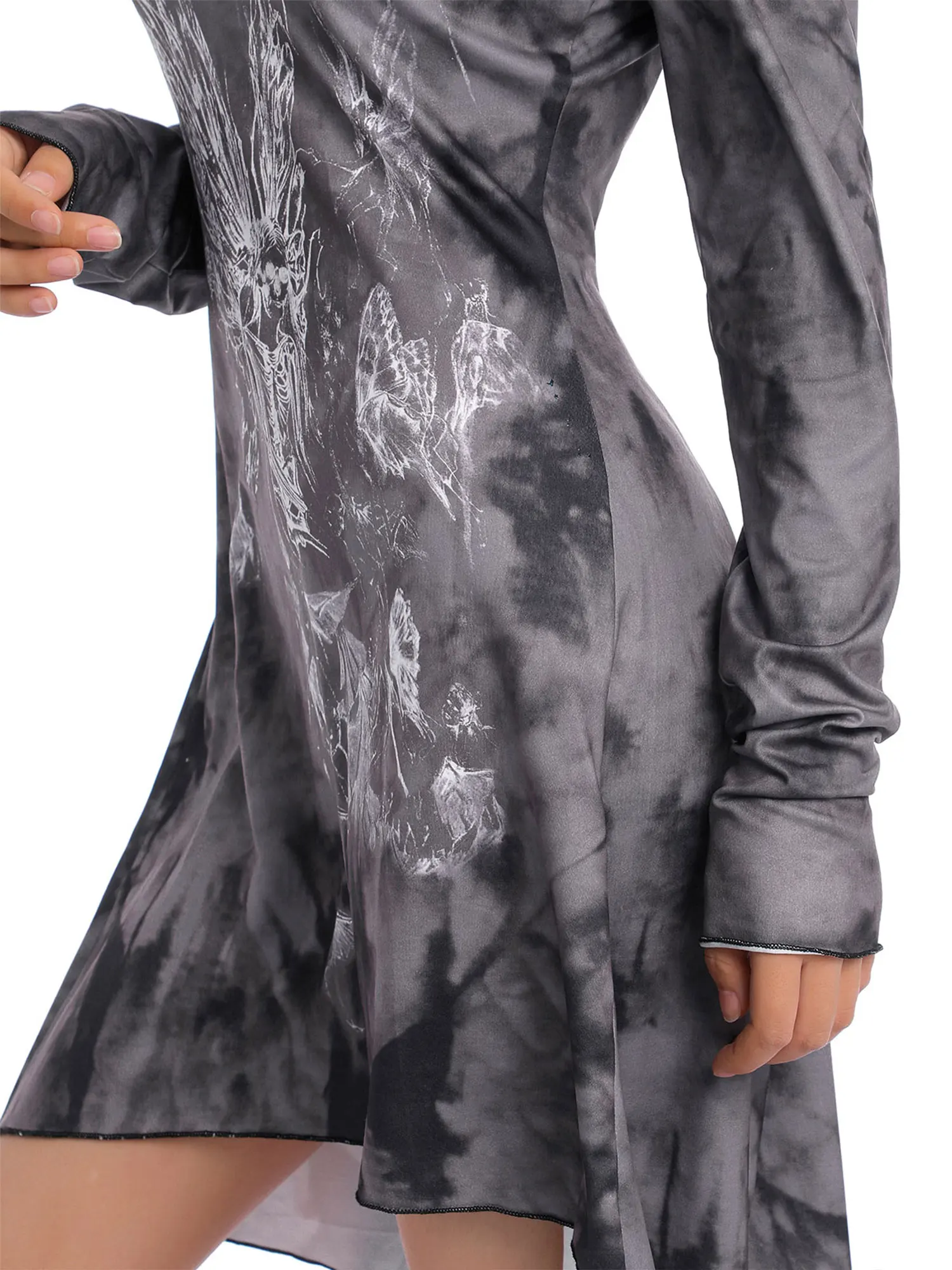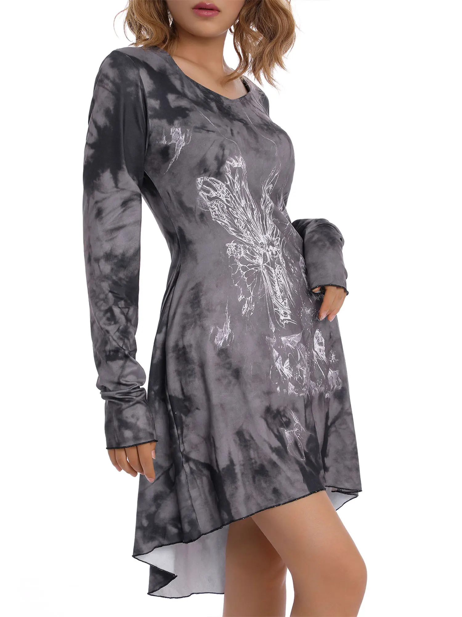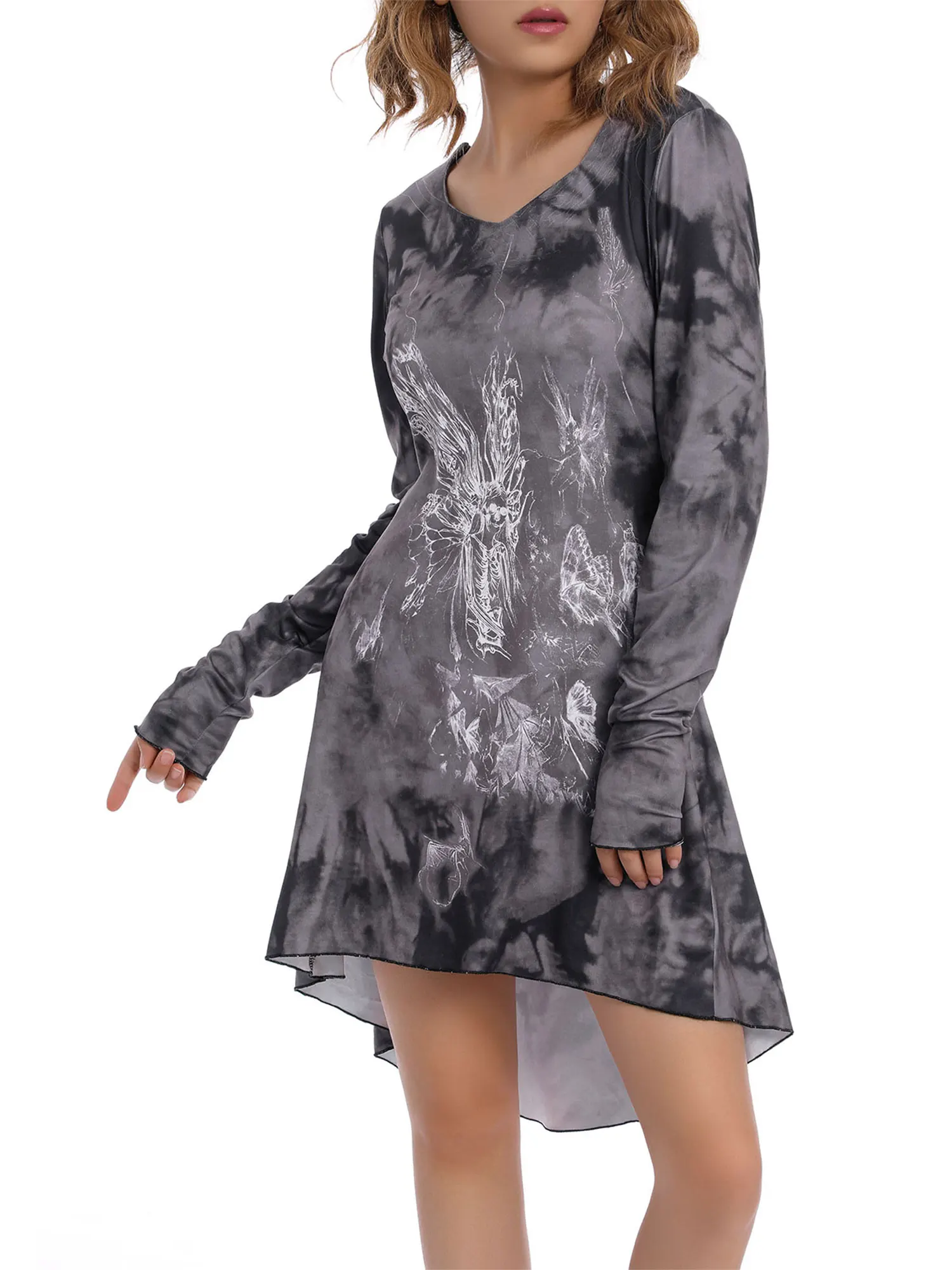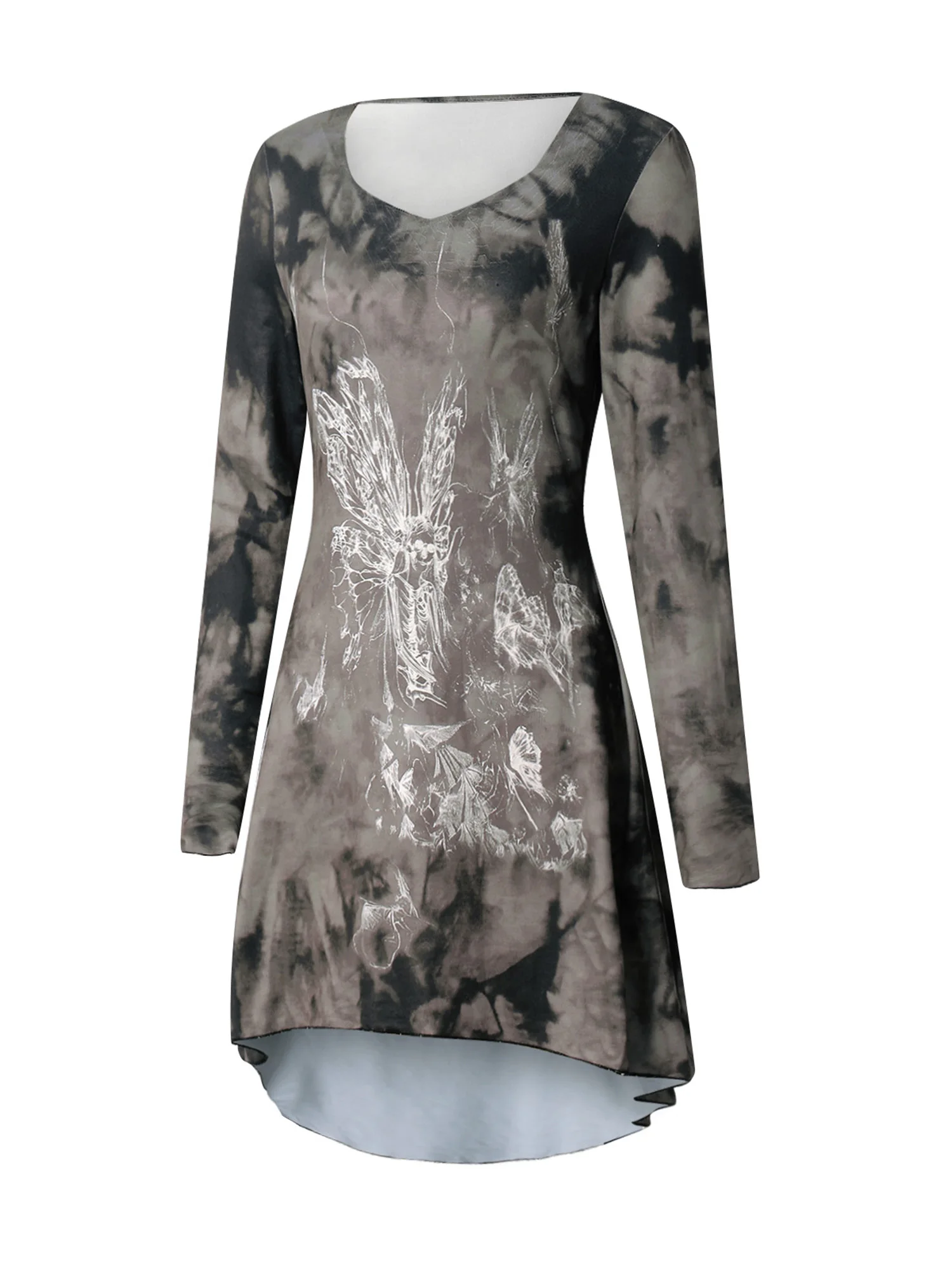Женская короткая юбка с принтом в стиле ретро, повседневное уличное платье Y2k с U-образным вырезом, средней талией, длинными рукавами и асимметричным подолом