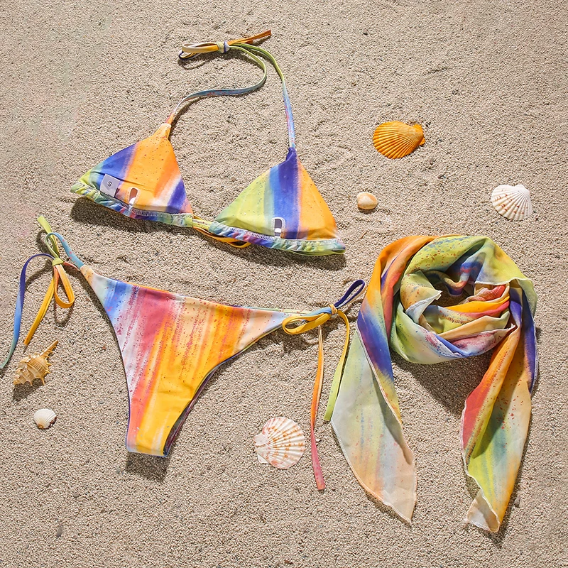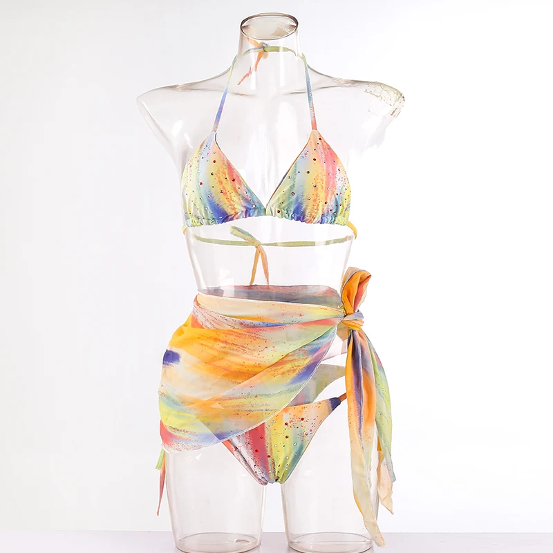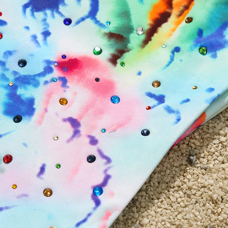 Сексуальное блестящее бикини со стразами 2021, купальник с принтом в виде галстука-красителя, 3 предмета, сетчатая юбка, купальник для женщин, купальный костюм с лямкой на шее