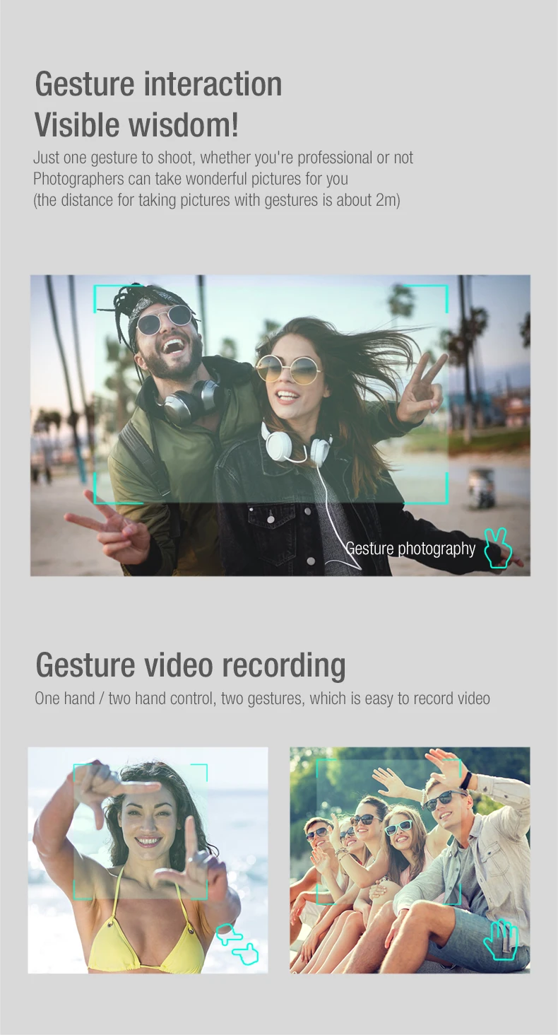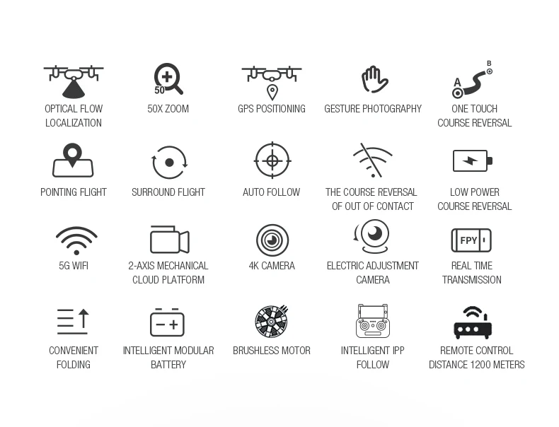 Функция: складной, запуск одной кнопкой, посадка одной кнопкой, удержание высоты, постоянный оптический поток, двойная камера, подключение по Wi-Fi, управление через приложение, фото жестов, запись жестов, Интеллектуальный IPP Next, режим следования со мной, управление ладонью (внизу слева направо), полет в удаленных точках, точки интереса, контроль скорости, Передача в реальном времени, обмен изображениями и видео в мВ, возврат домой GPS.