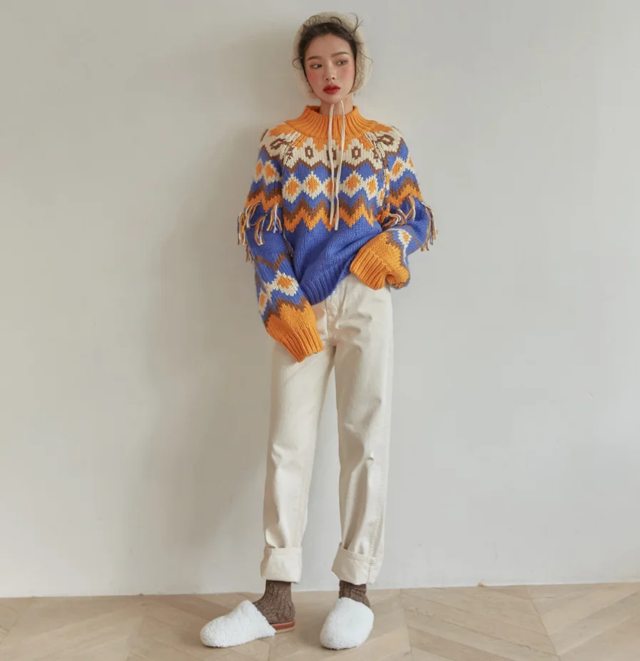 Женский жаккардовый свитер с длинным рукавом, теплый винтажный Красный джемпер с кисточками в стиле бохо для осени и зимы