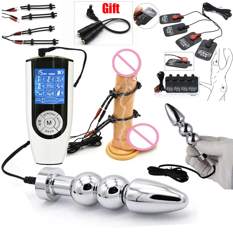 Комплект для импульсного массажа с электрическим током, анальная пробка из нержавеющей стали, массажное кольцо для пениса, электрический стимулятор, мужской секс-игрушка для мастурбации