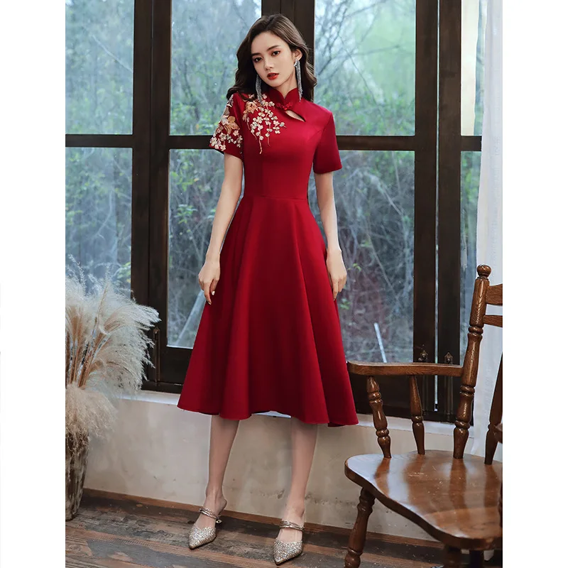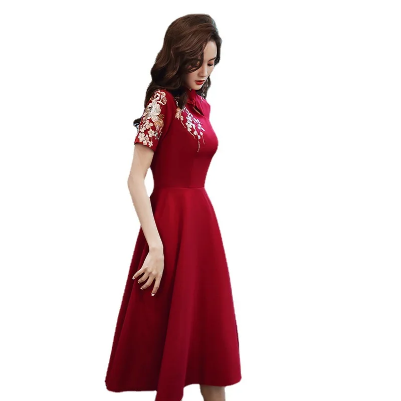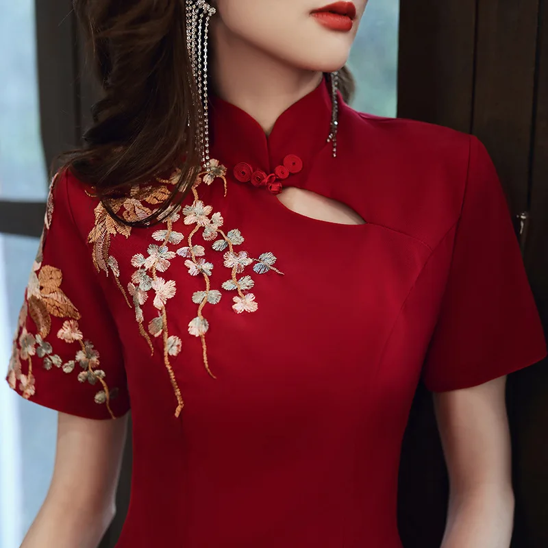 Винтажное красное свадебное Ципао, новинка, роскошное элегантное платье с вышивкой, с коротким рукавом, ТРАПЕЦИЕВИДНОЕ женское вечернее платье