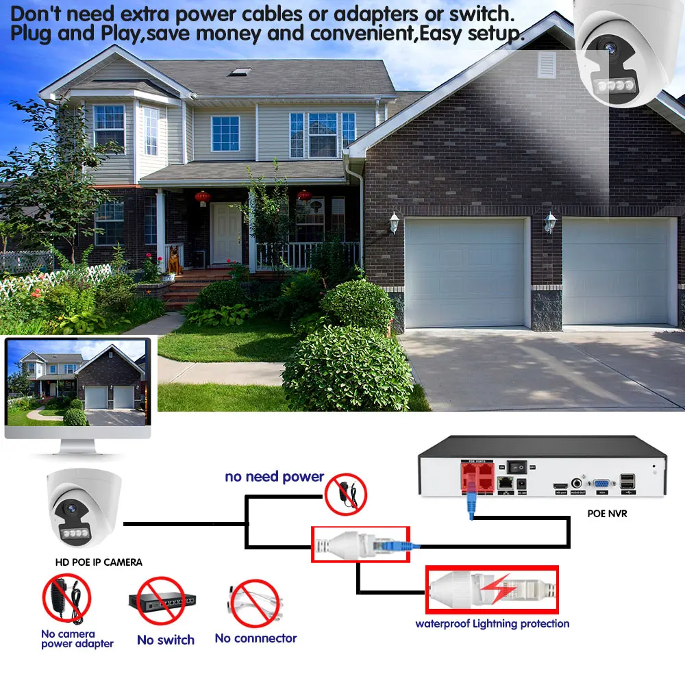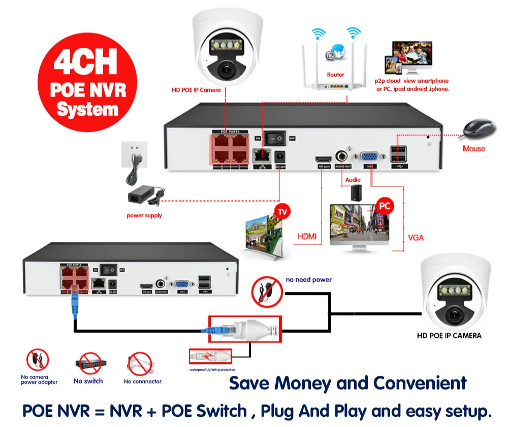 Нет дополнительных кабелей питания или адаптеров, просто подключив ip-камеру к NVR с помощью одного кабеля, вы можете легко завершить установку без знания о компьютере или сети и начать наслаждаться супер простым мониторингом среди вашего смартфона, планшета или ПК.