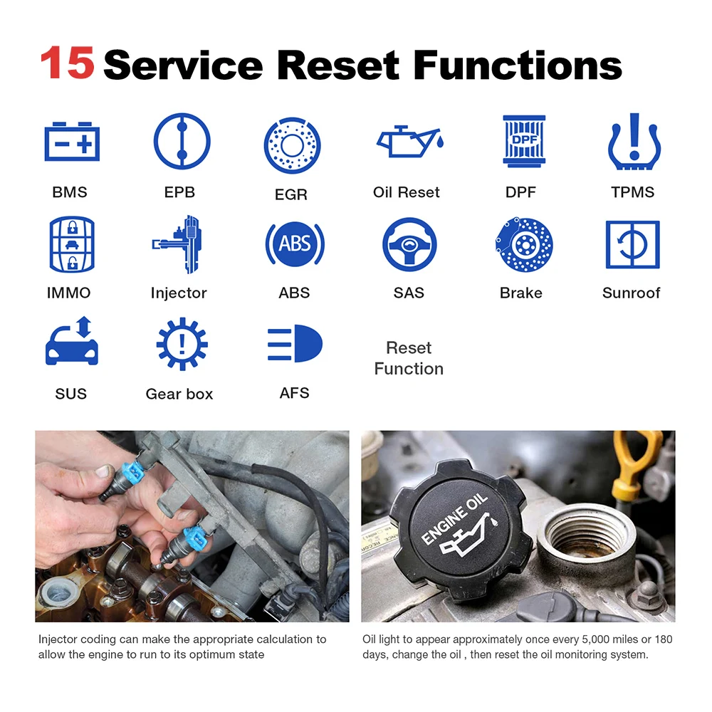 15 kind of reset functionsGear learning , Injector coding , ABS bleeding , ect