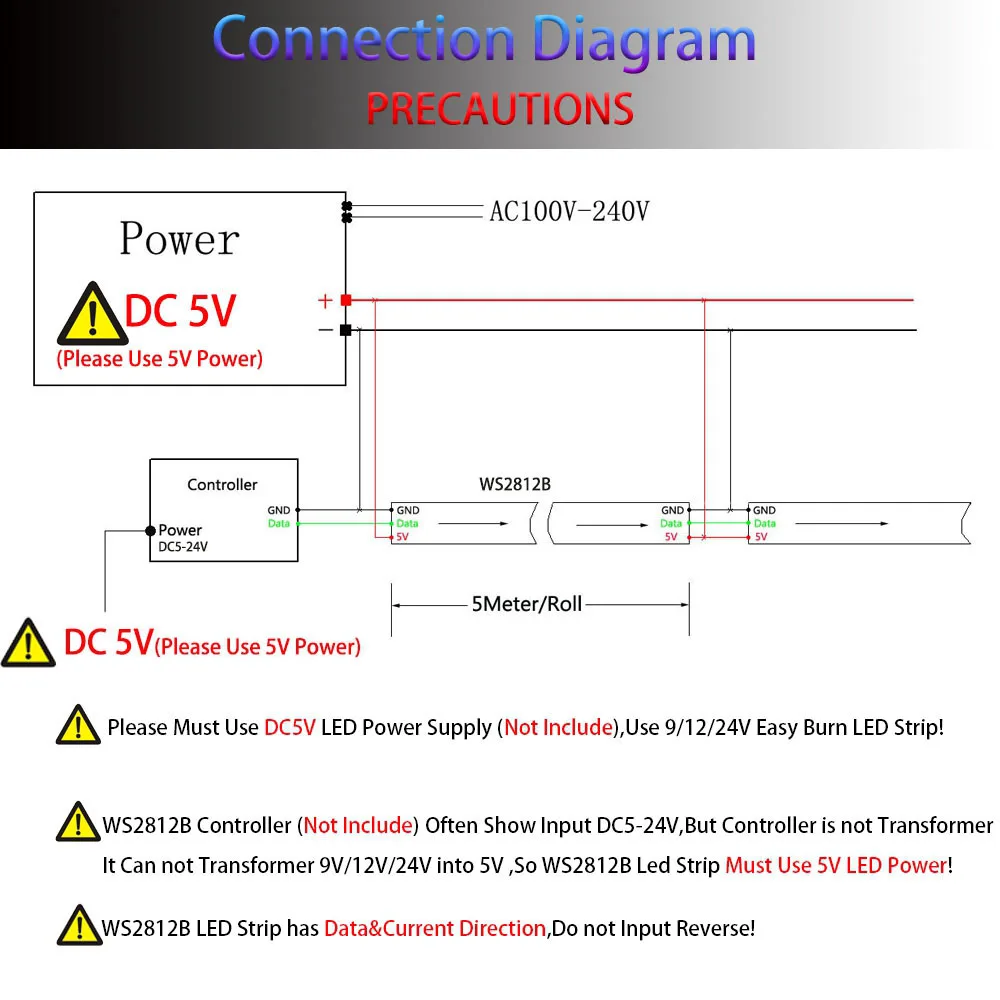 1. WS2812B Светодиодная лента питается от"5 в источник питания"(Не входит в комплект) и контролируетсяОдна линия передачи данных от подходящего контроллера(Не входит в комплект).