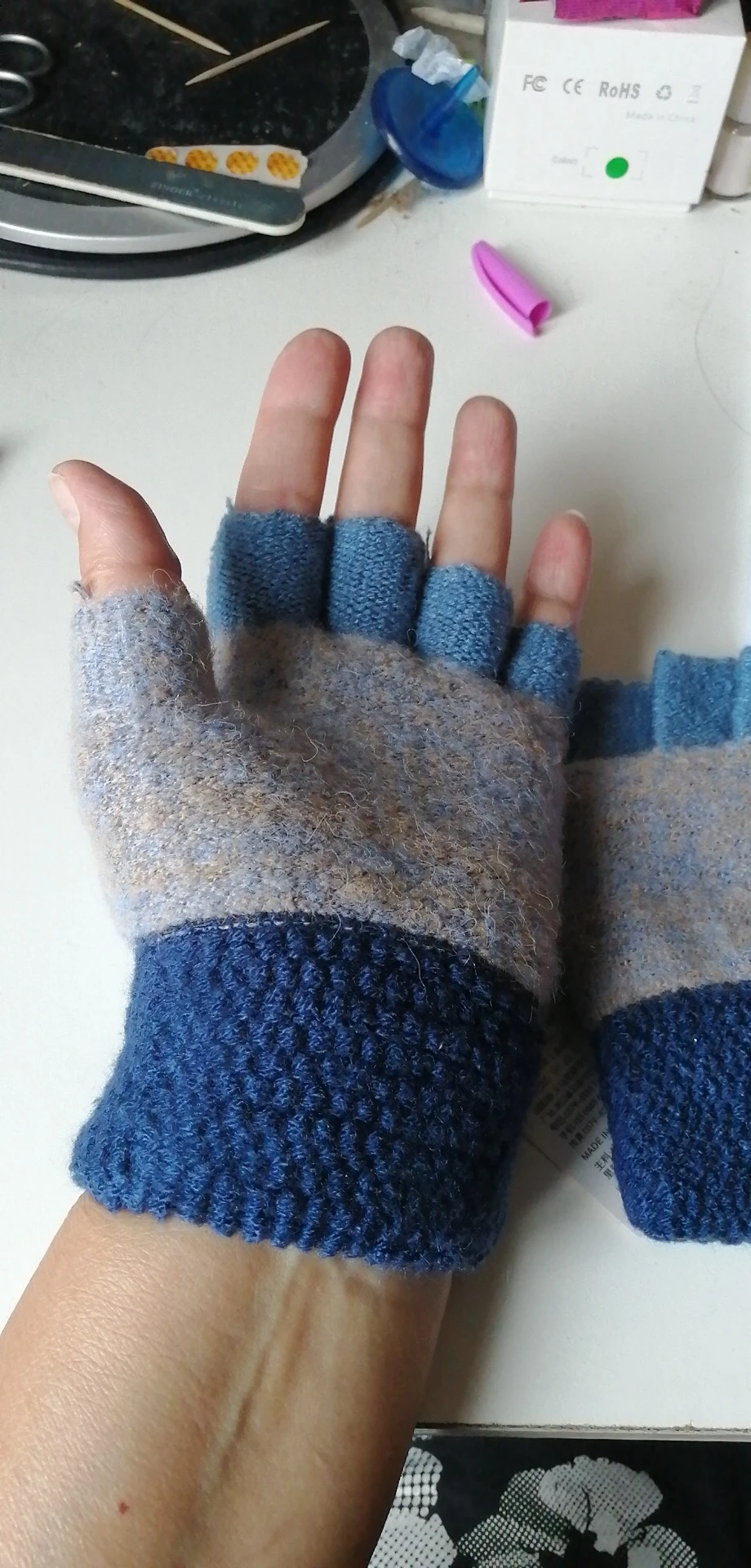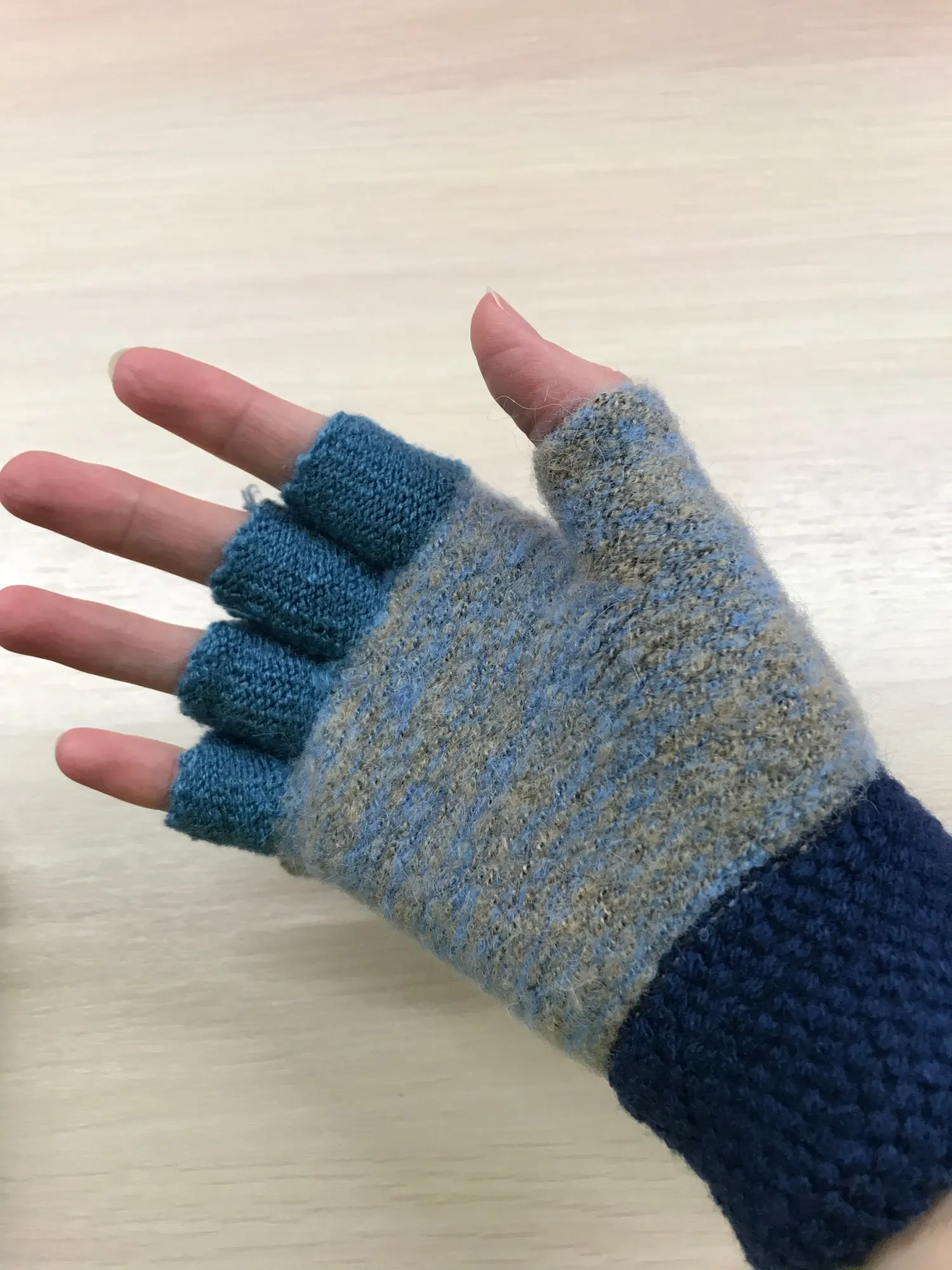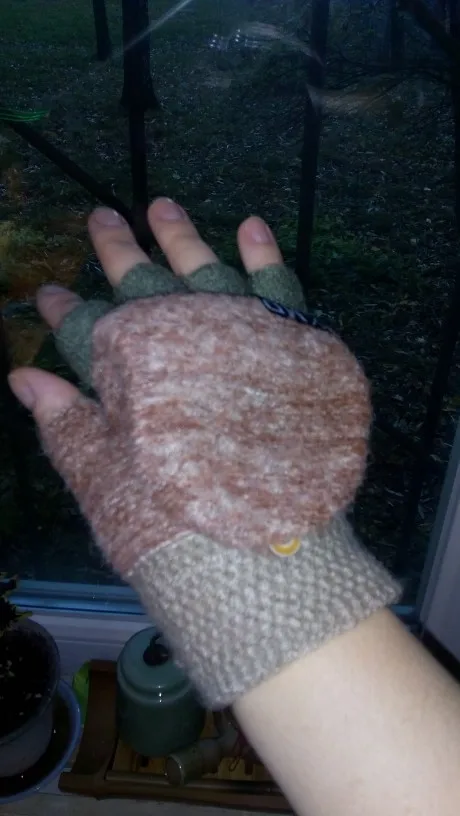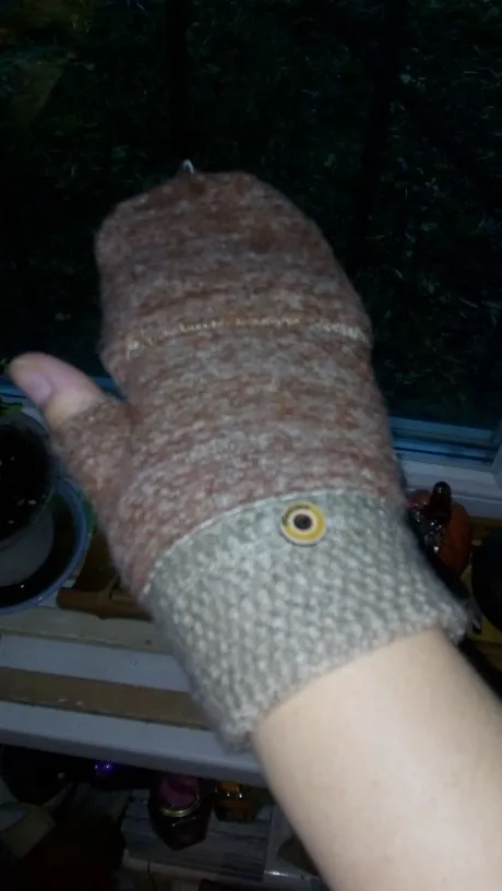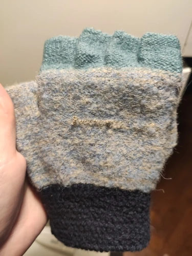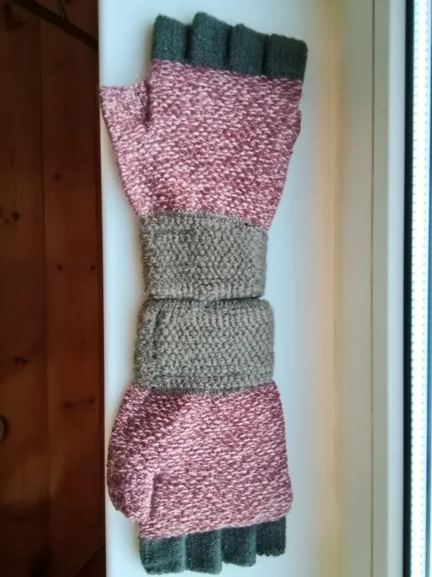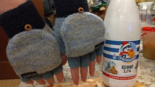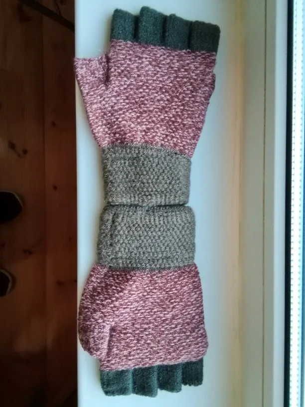 Полуперчатки тёплые, но большой палец всегда открыт. Выполнены достойно, вязка аккуратная. Изнанка почти норм, немного торчат нитки, но не критично. Петелька-резинка для перестежки в варежки вшита очень аккуратно, удобно расстегивать.