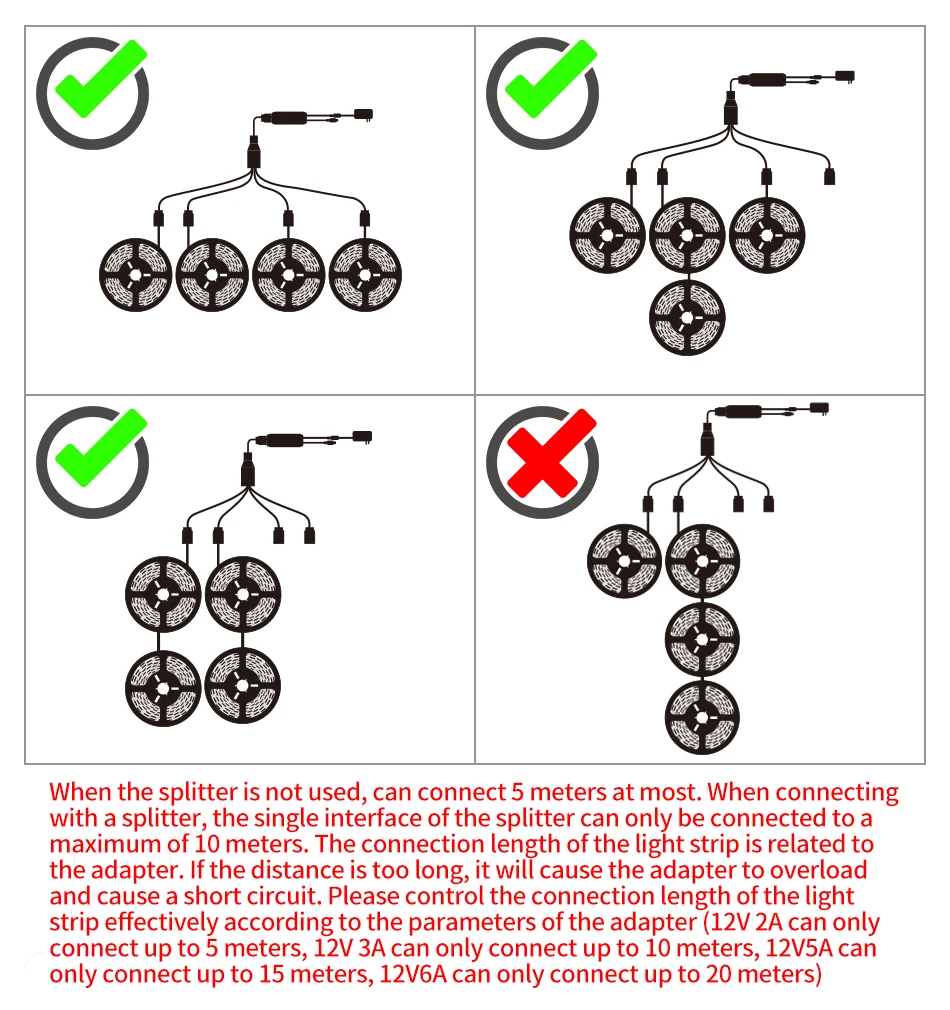 * Самый длинный дальний светильник-полоса-20 метров. Длина удлинителя ленты на светильник зависит от адаптера. Если расстояние слишком длинное, адаптер превысит нагрузку и вызовет короткое замыкание.
