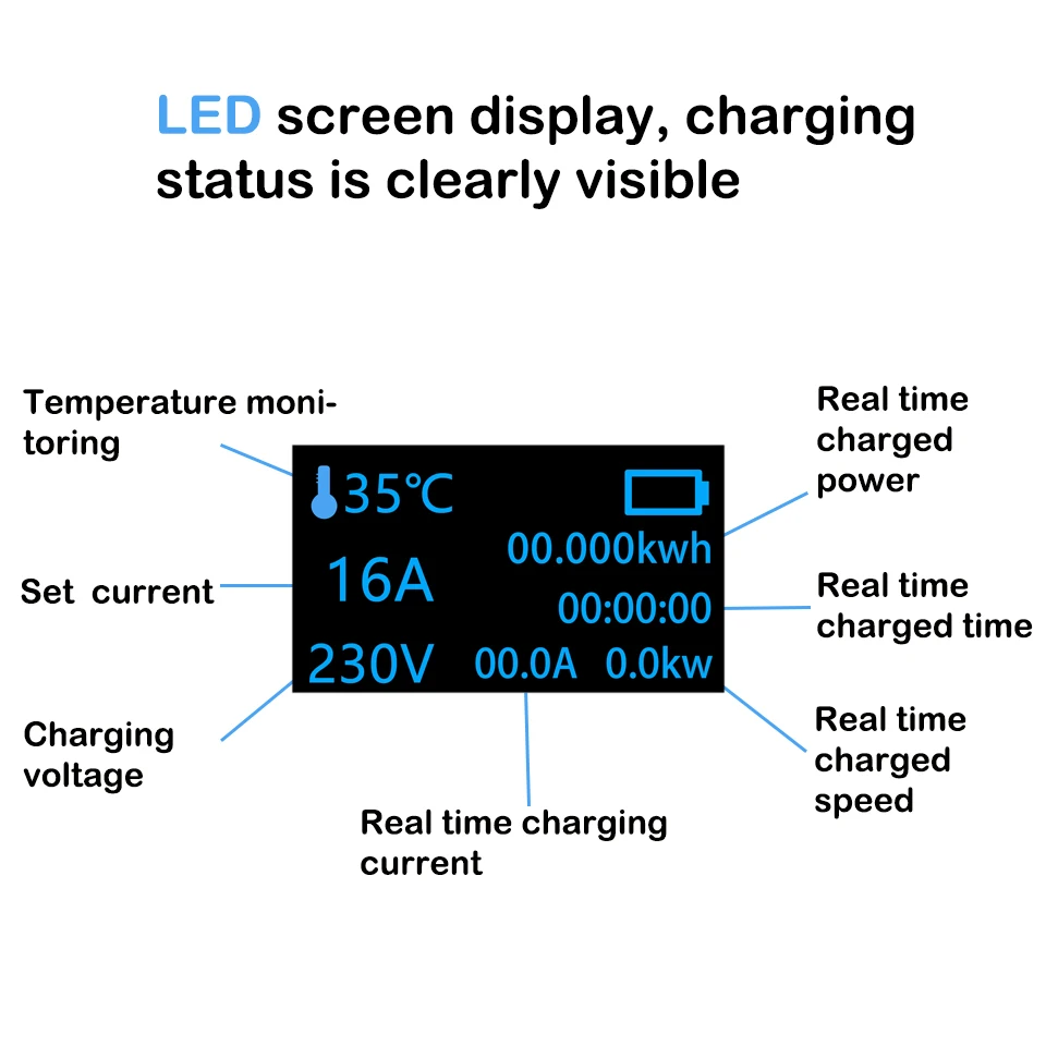 Светодиодный дисплей:1. Температура зарядки2. Зарядный ток3. Напряжение зарядки4. Зарядка энергии, кВт/ч5. Настройка тока6. Скорость зарядки (кВт)
