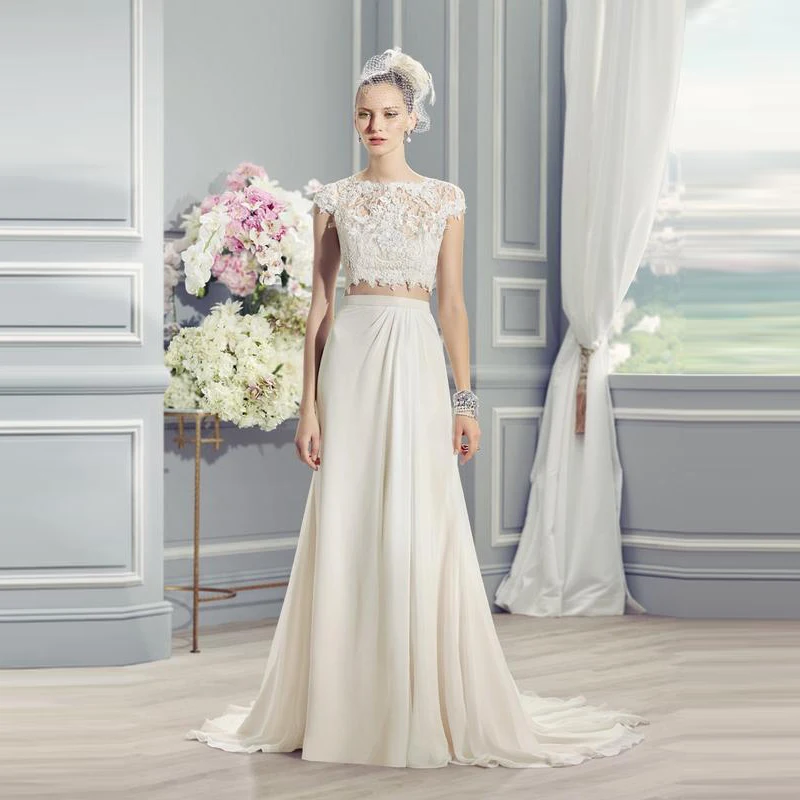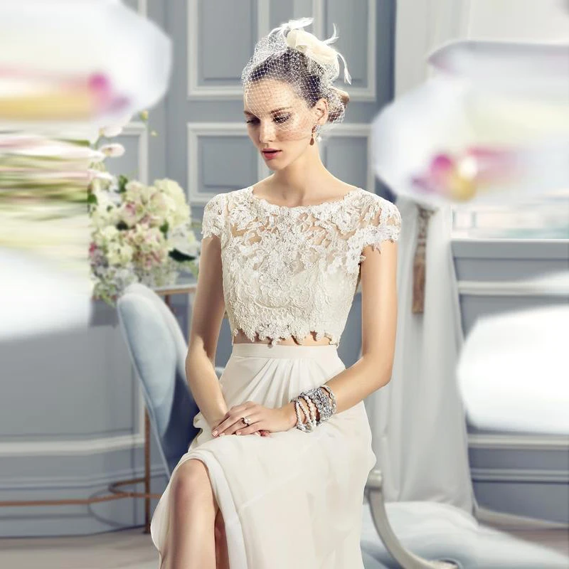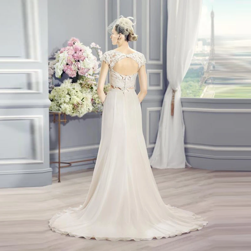 Кружевное Свадебное платье невесты, комплект из двух предметов, с коротким рукавом и круглым вырезом, с аппликацией на спине