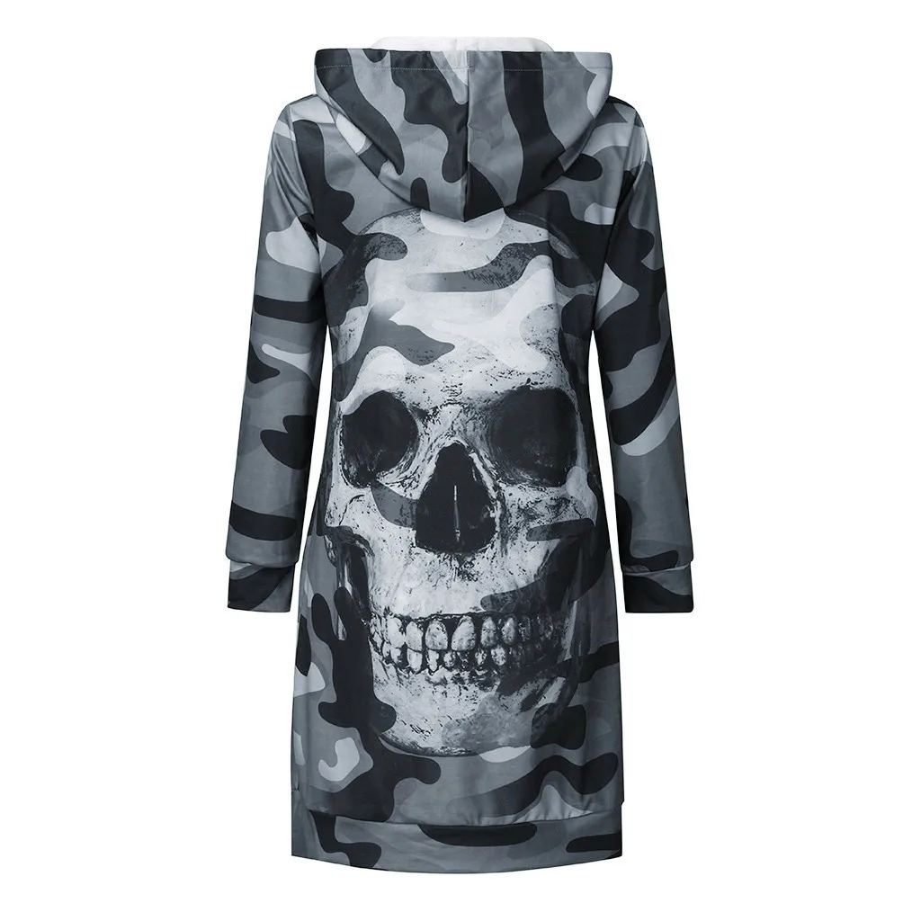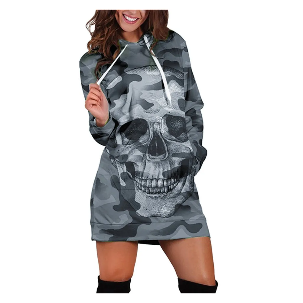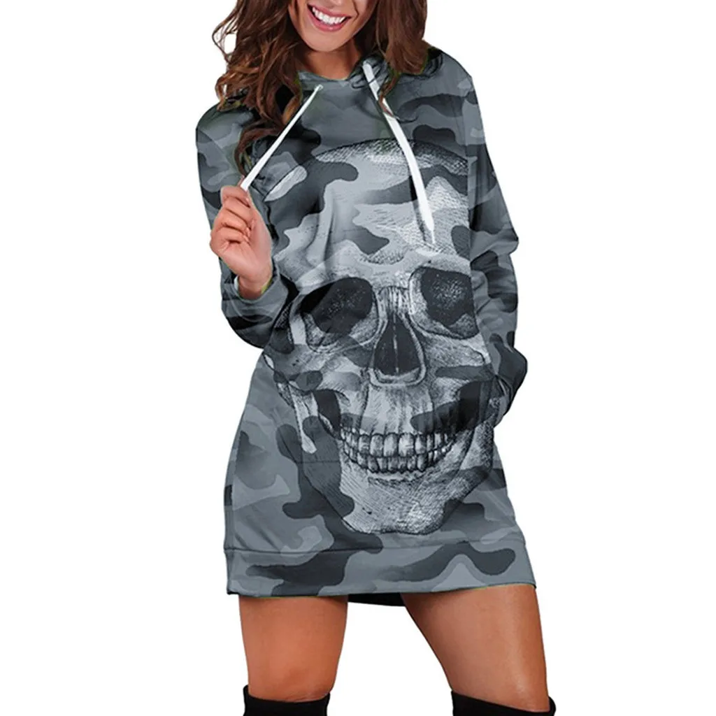 Модное женское платье с длинным рукавом, повседневное мини-платье с капюшоном и принтом черепа, с карманами, осенне-зимние женские платья 2020