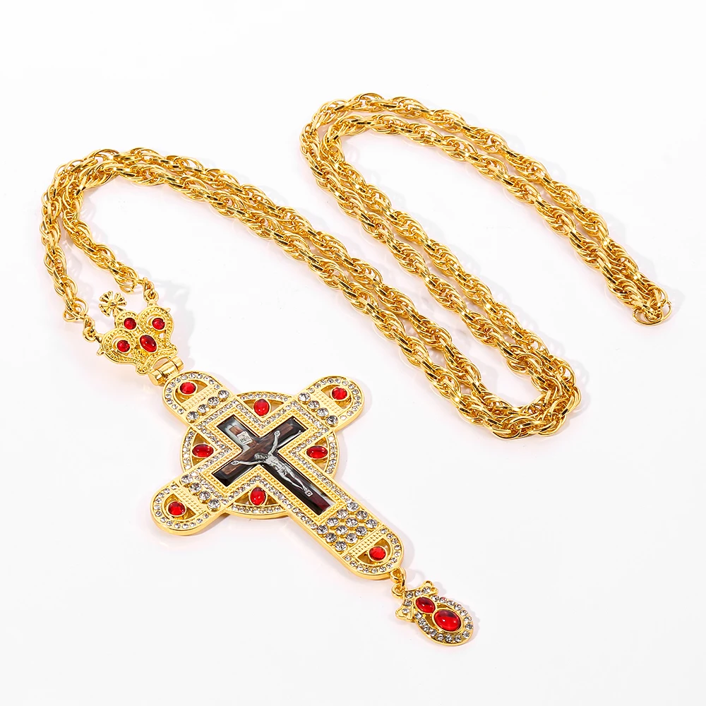 Крест на грудную клетку, золотое ожерелье для христианской церкви, Красный Кристалл, распятие священника, православная нить, религиозные иконы, кулон