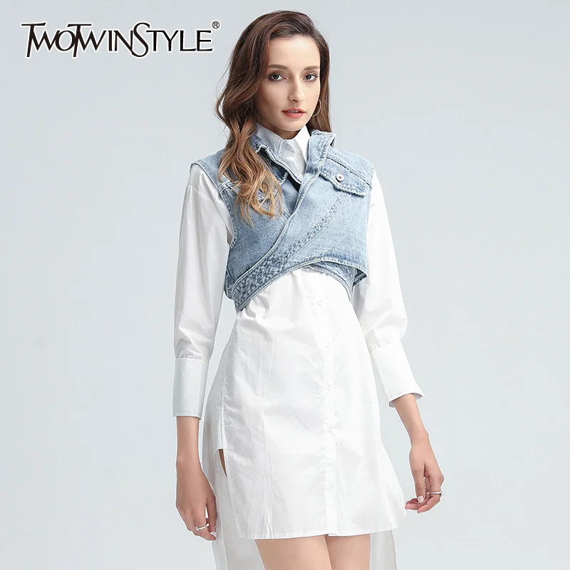 Женское джинсовое пальто TWOTWINSTYLE, синее пальто с лацканами, без рукавов, с высокой талией, на шнуровке, 2020