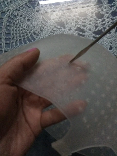 хорошая силиконовая мягкая,дырки не проделаны, но места обозначены.на голову одевается достаточно плотно.пришло вместе с крючком.
