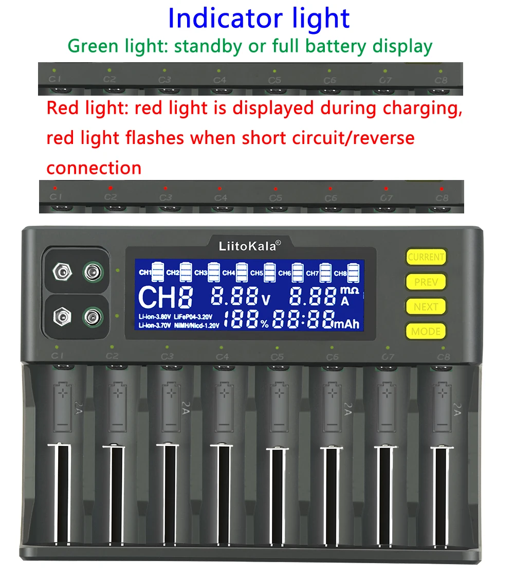 4,1 литий-ионные батареи (3,70 в/3,80 в) и литий-железо фосфатные батареи (3,20 в) на электричестве, согласно покупке батареи внутреннее сопротивление путем обнаружения системы автоматической конфигурации размера тока, если вы хотите изменить размер зарядного электрического тока, может быть длительным нажатием тока, Во-первых, чтобы мигать, показывая короткое значение тока в соответствии с текущей клавишей, вы можете выбрать зарядный ток (A/0,50 0,30 0,70 2,00 1,00 A/A) (Примечание: В течение первых 1/3/6/8 слот максимальный зарядный ток никель-металл-2,0 A, 1,0 максимум в течение первых 2/4/5/7 слотов). Ток зарядки между первым и вторым слотами, третьим и четвертым слотами, пятым и шестым слотами и седьмым и восьмым слотами не будет превышать 2а в общей сложности, то есть когда один слот заряжается от тока 2A, а затем поместите аккумулятор в другой слот, Ток 2A будет падать до 1 А;