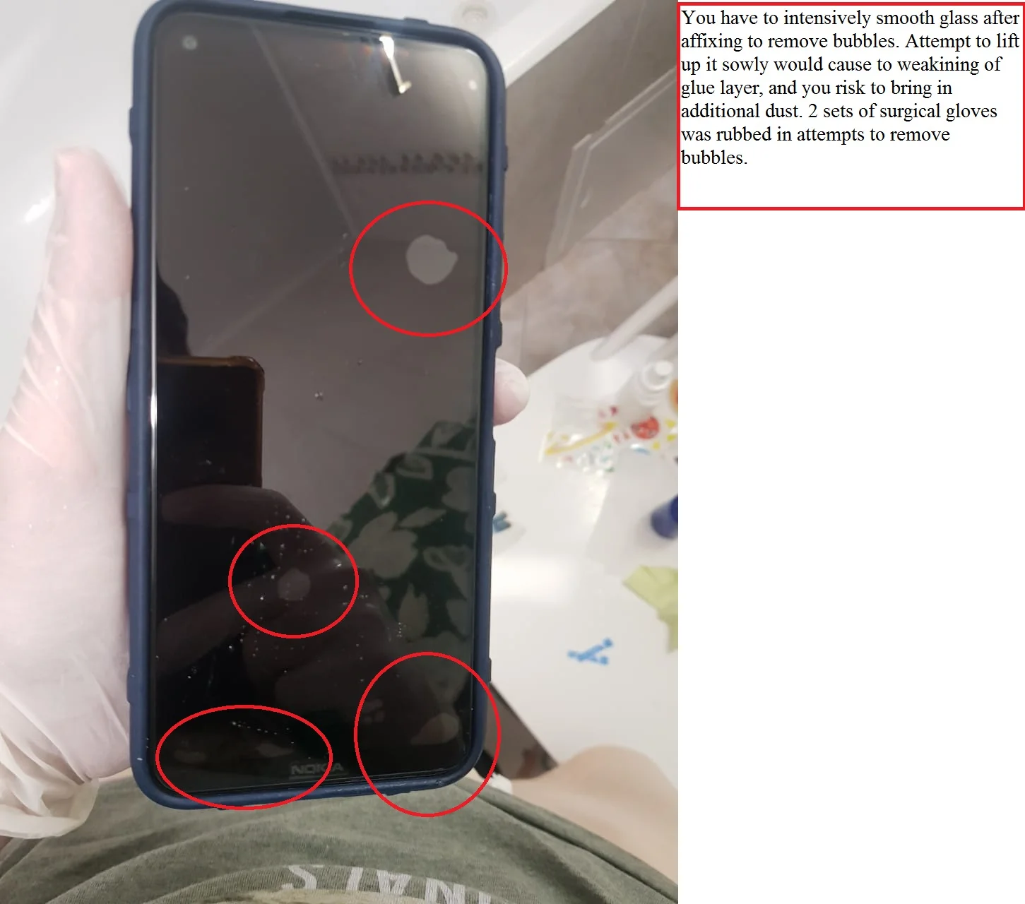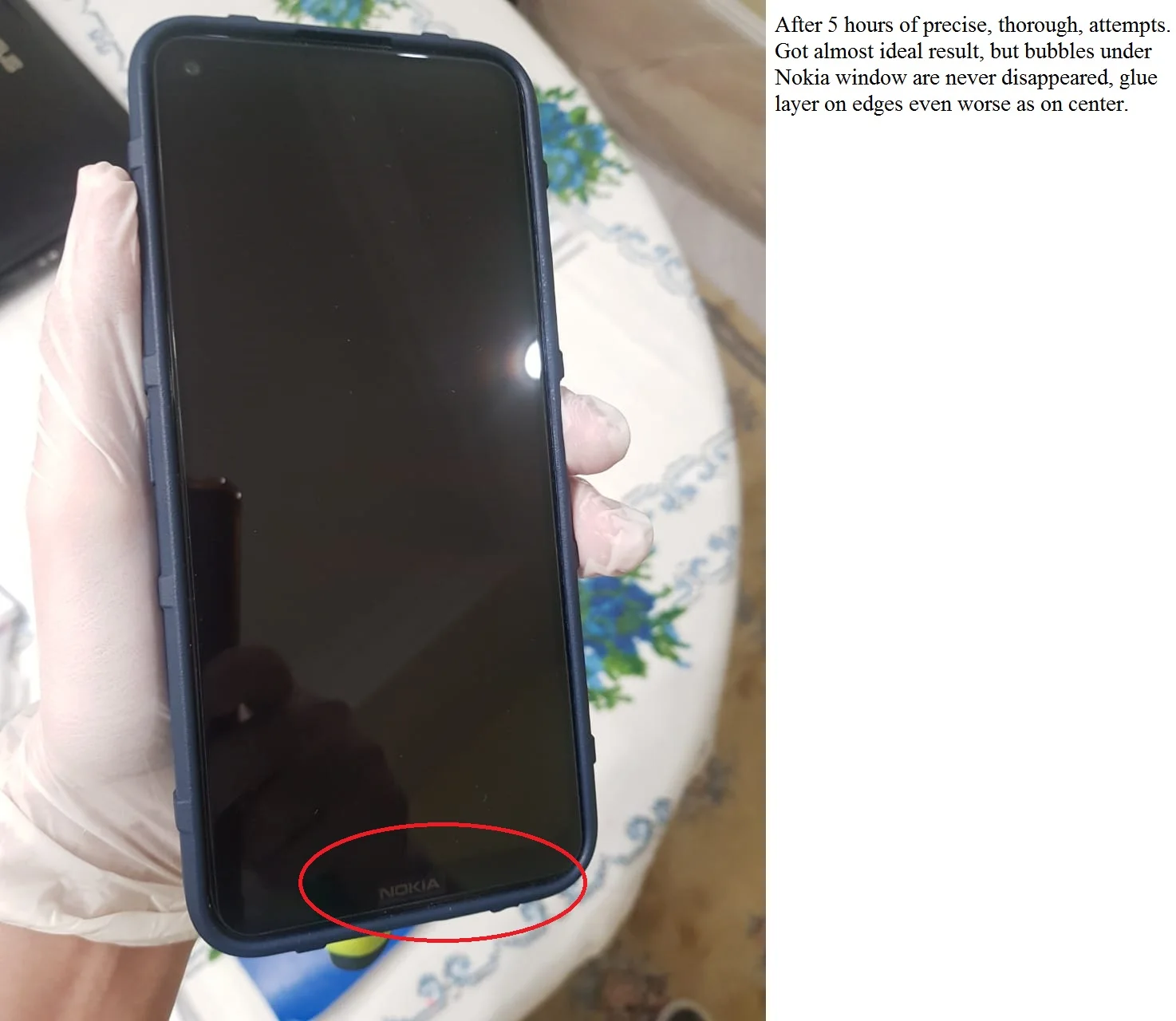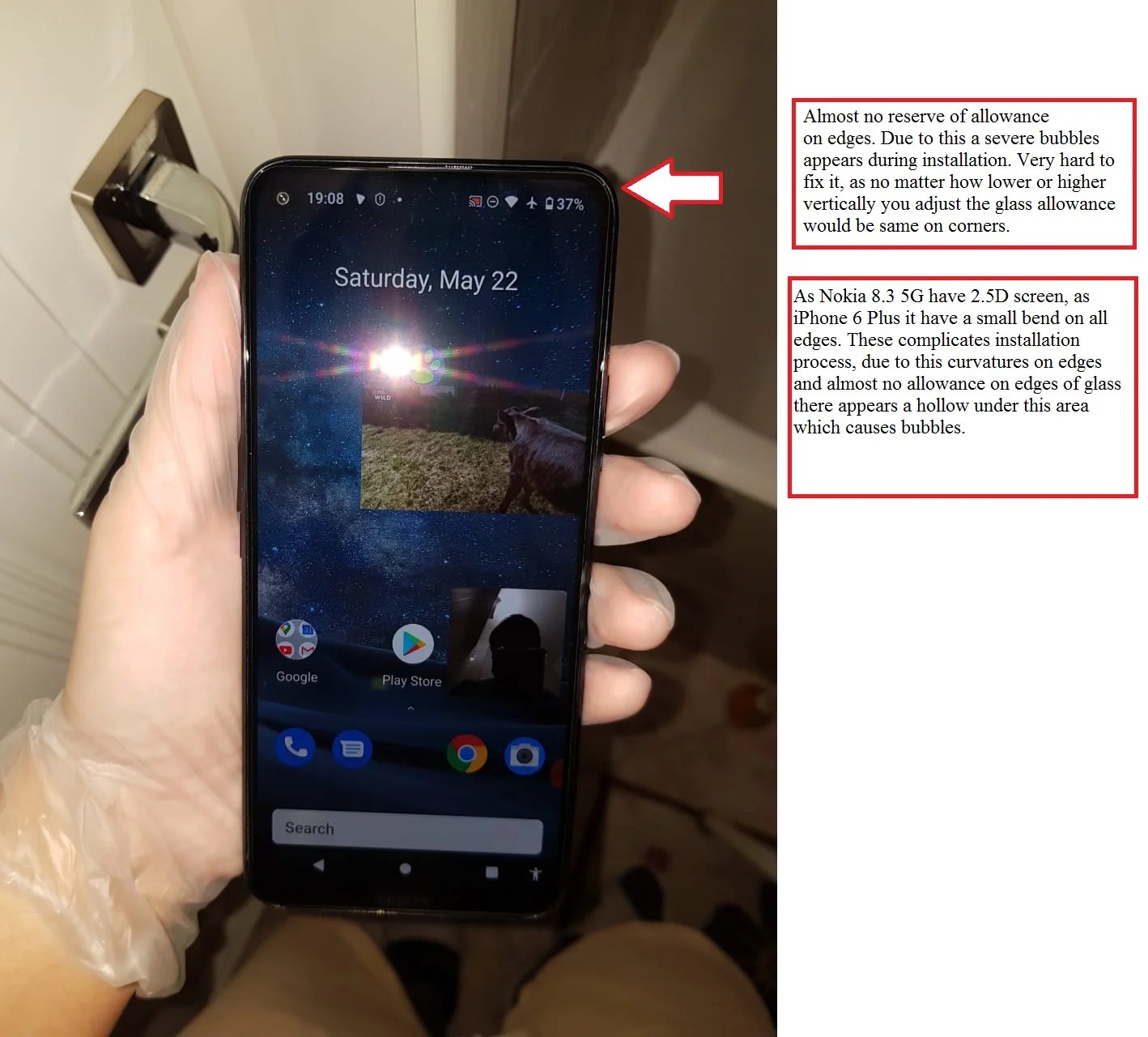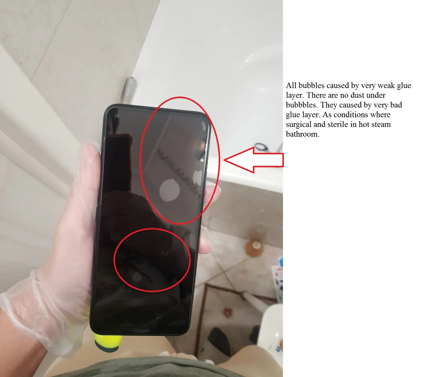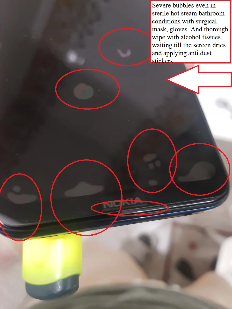 Сильные пузыри даже в стерильных горячих паровых условиях ванной с хирургической маской, перчатками. Тщательно протирать спиртовыми салфетками и ждать, пока экран не высохнет и только после нанесения наклеек против пыли. После установки вы должны интенсивно разгладить стекло, чтобы удалить пузырьки. Любые усилия, которые медленно поднимают его, могут привести к ослаблению клеевого слоя, и вы рискете принести дополнительную пыль. 2 набора хирургических перчаток были натерты в целях удаления пузырьков. Все пузыри, вызванные очень слабым слоем клея, нет пыли под пузырьками. Они вызваны очень плохим слоем клея, в условиях, когда хирургические и стерильные в горячей ванной. После 5 часов тщательной, тщательной работы по выравниванию и приклеиванию я получил почти идеальный результат, но пузырьки под окнами Nokia никогда не исчезли, слой клея на краях еще хуже, как на центре. Так как Nokia 8,3 5G имеет кривизну 2.5D на краях, как iPhone 6 Plus, на углах стекло имеет почти полное покрытие с экраном, допустимо менее 0,1 мм.