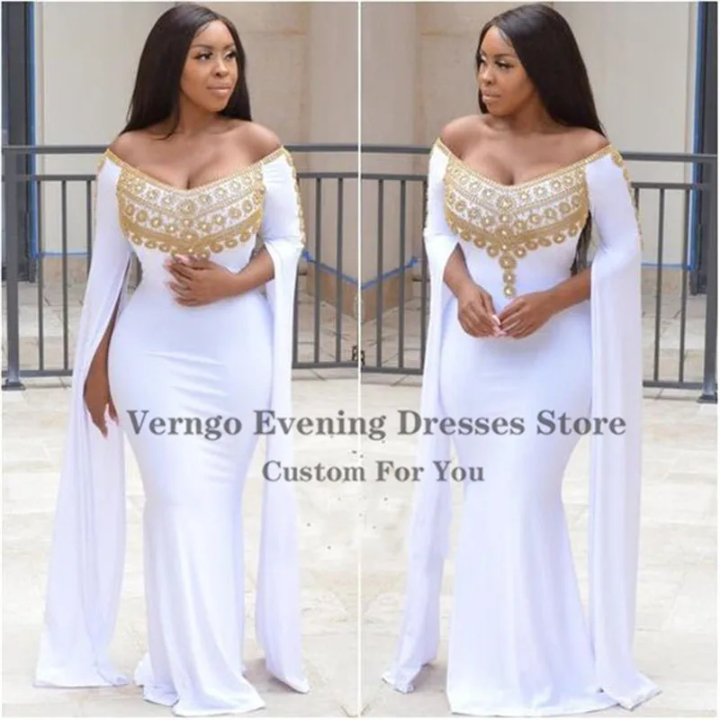 Verngo африканские белые вечерние платья русалки с открытыми плечами, платья для выпускного вечера с золотой аппликацией размера плюс, вечернее платье Абайи