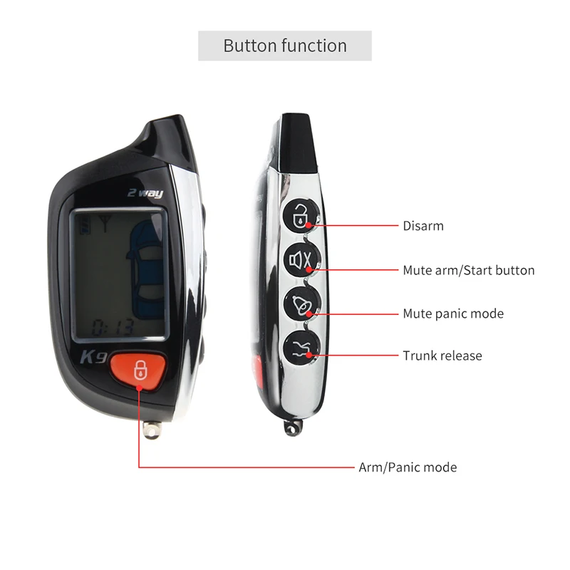 Основные характеристики:2-сторонняя автомобильная сигнализация с ЖК-дисплеемСупер длинное дистанционное рабочее расстояние (800-1200м)Дистанционный запуск двигателяРежим турботаймераПредупреждение о тревоге